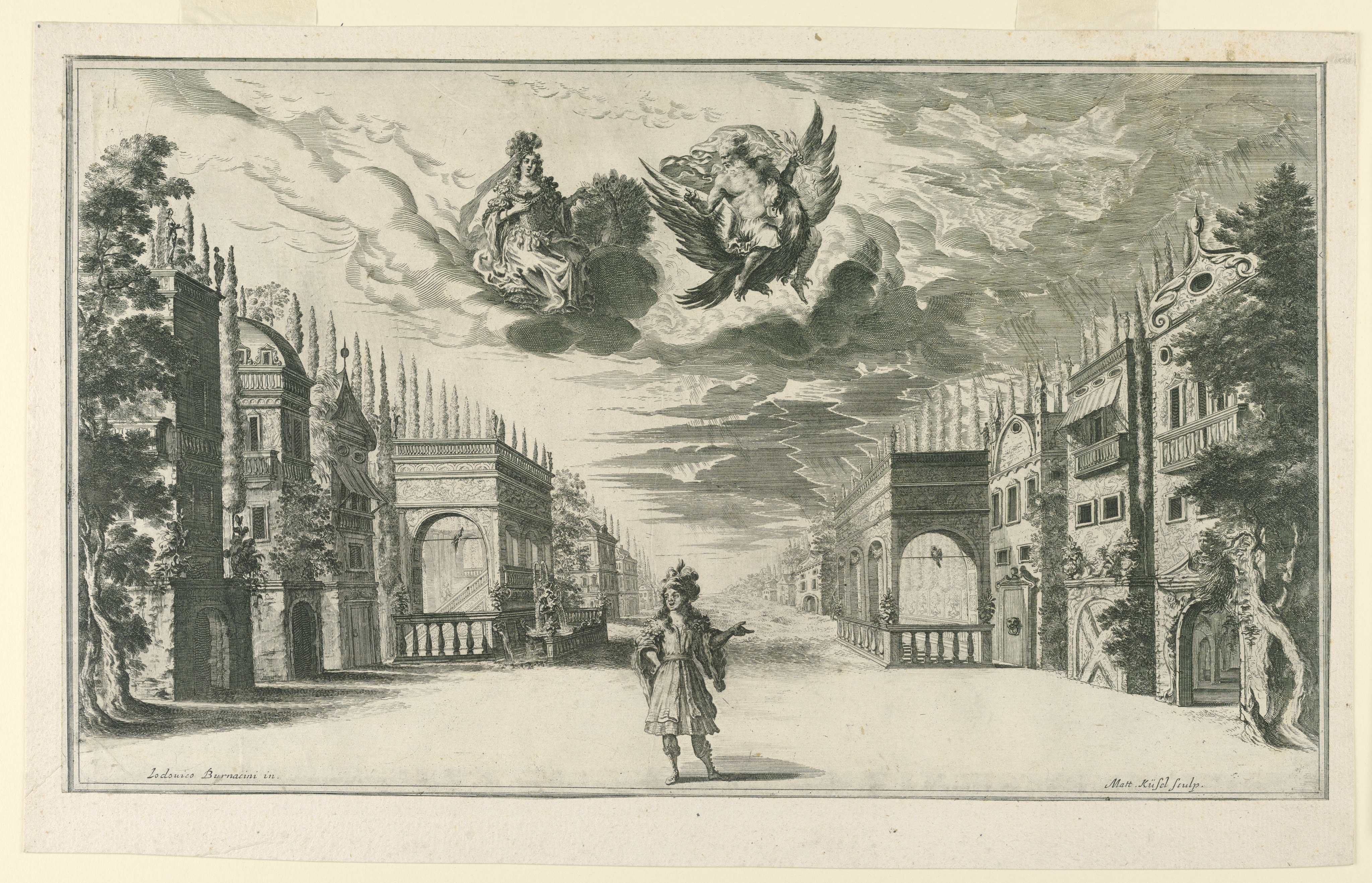 This is a Print. It was written by Francesco Sbarra and music composed by Pietro Antonio Cesti and print maker: Mathias Küssel and after Ludovico Ottavio Burnacini. It is dated 1667 and we acquired it in 1962. Its medium is engraving in black ink on paper. It is a part of the Drawings, Prints, and Graphic Design department.