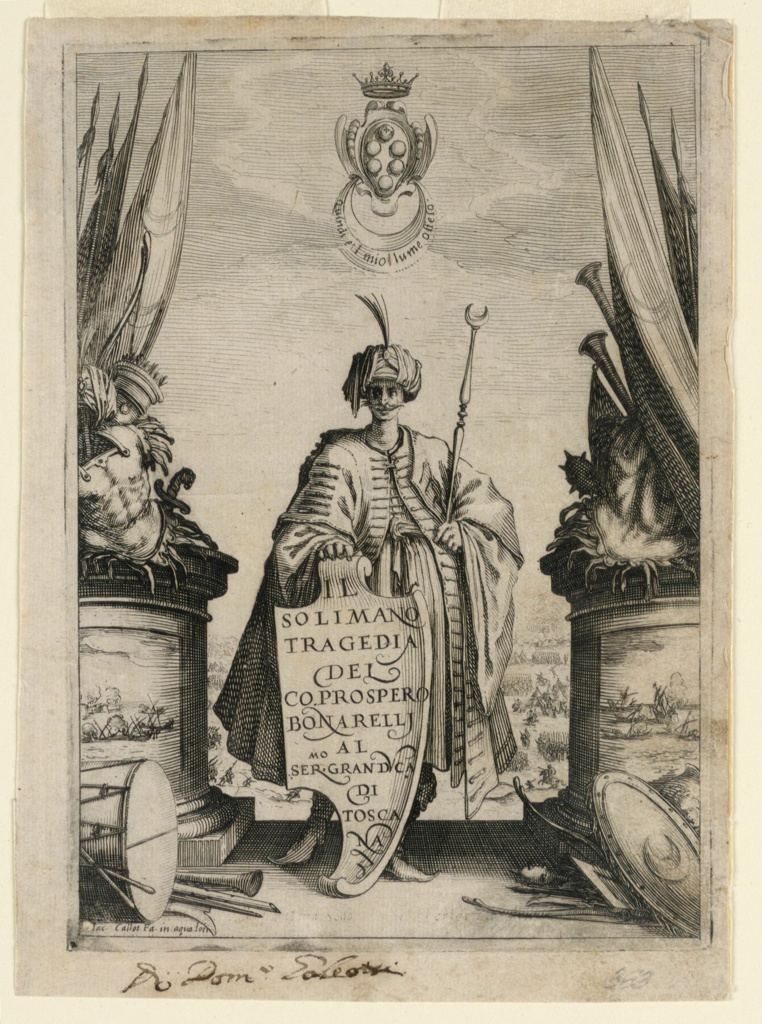 Print, Frontispiece of Soliman, Second State; Designed by Jacques Callot; France; black ink on paper; Platemark: 20 × 14 cm (7 7/8 × 5 1/2 in.); Museum purchase through gift of Mrs. William G. Fitch; 1962-192-2