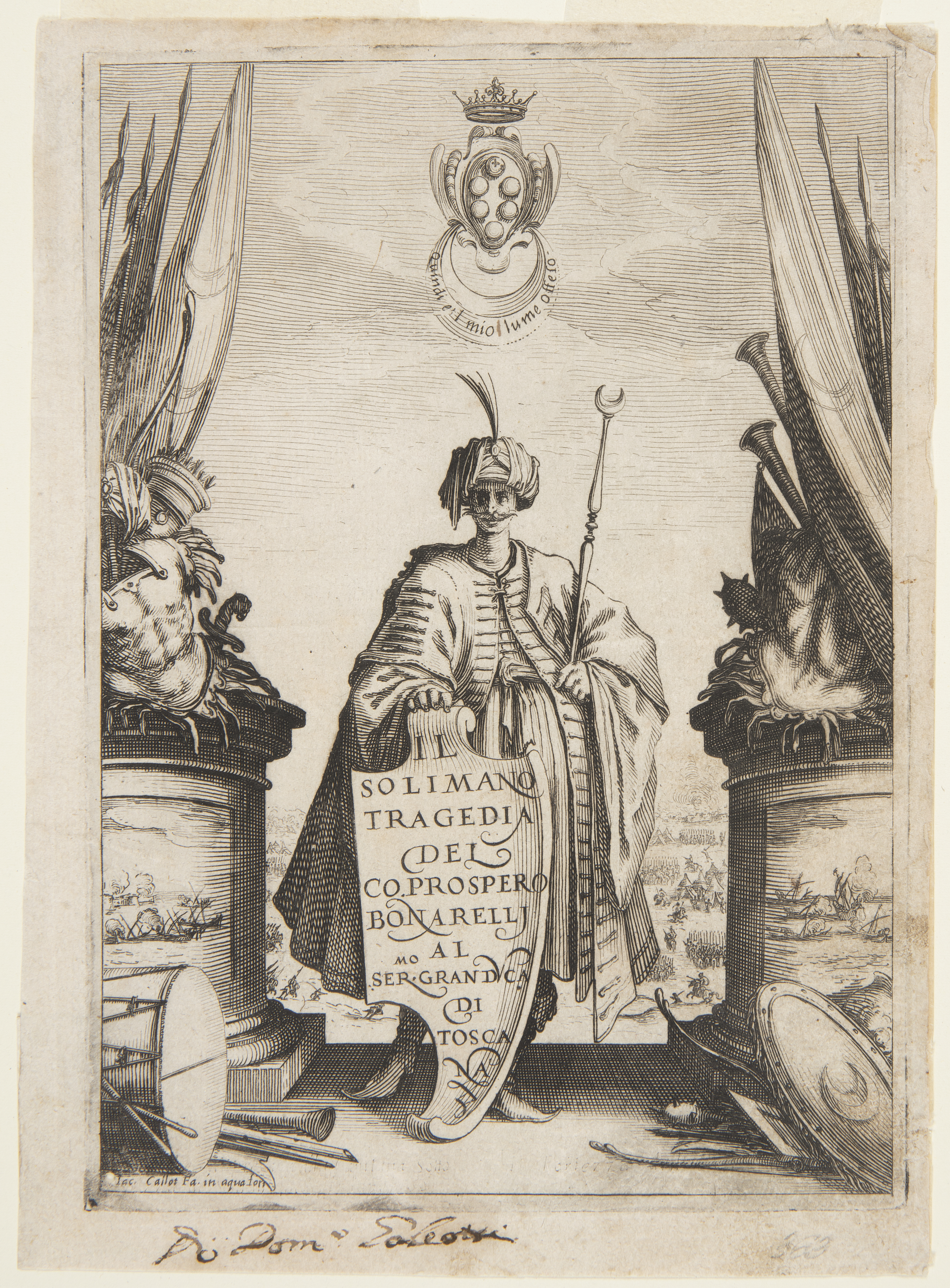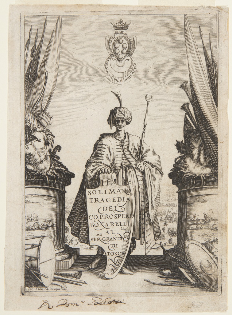Print, Frontispiece of Soliman, Second State; Designed by Jacques Callot; France; black ink on paper; Platemark: 20 × 14 cm (7 7/8 × 5 1/2 in.); Museum purchase through gift of Mrs. William G. Fitch; 1962-192-2