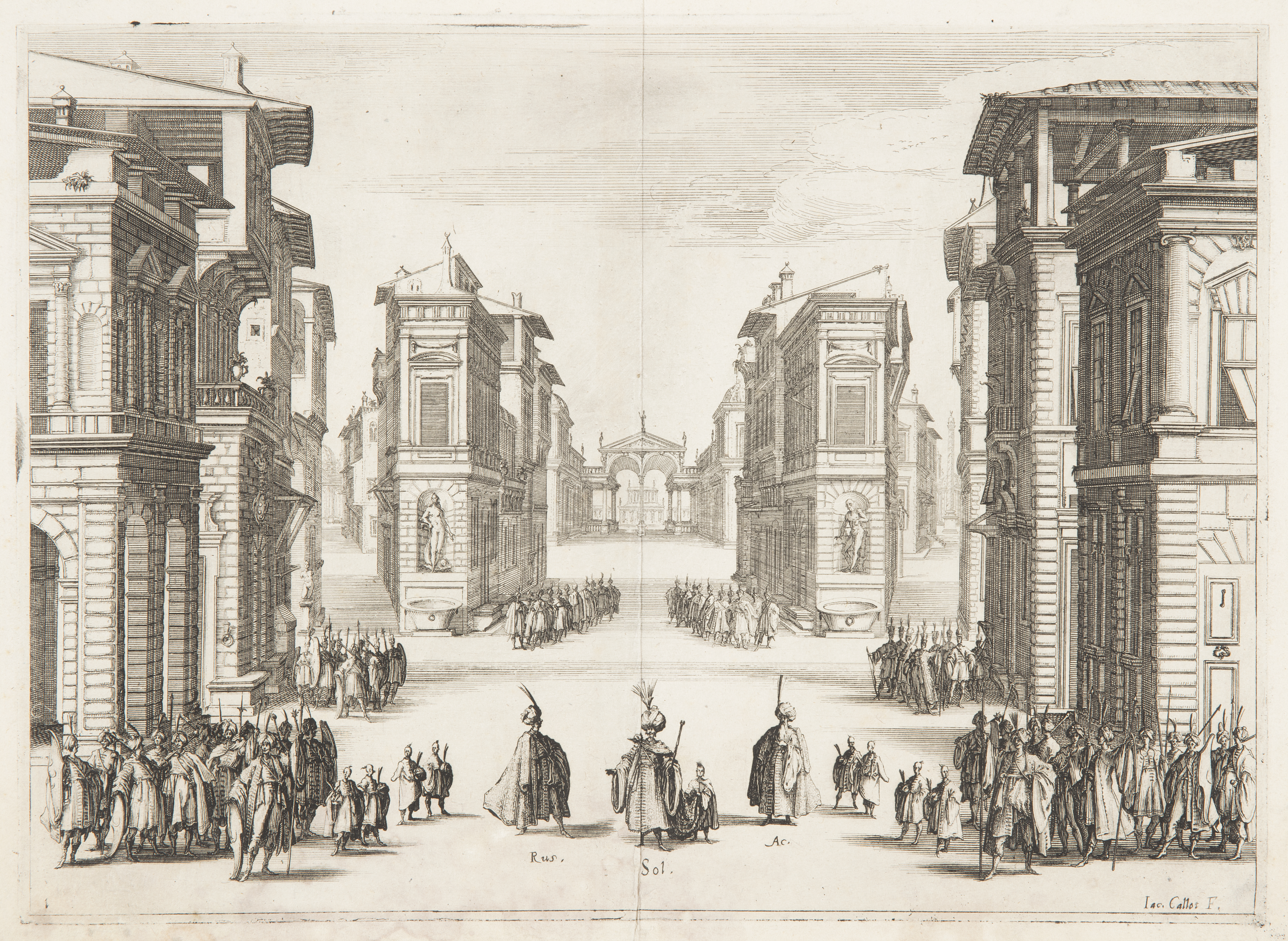 Print, First Act of Soliman; Designed by Jacques Callot; France; engraving with black ink on paper; H x W: 20 × 27.8 cm (7 7/8 × 10 15/16 in.); Museum purchase through gift of Mrs. William G. Fitch; 1962-192-3