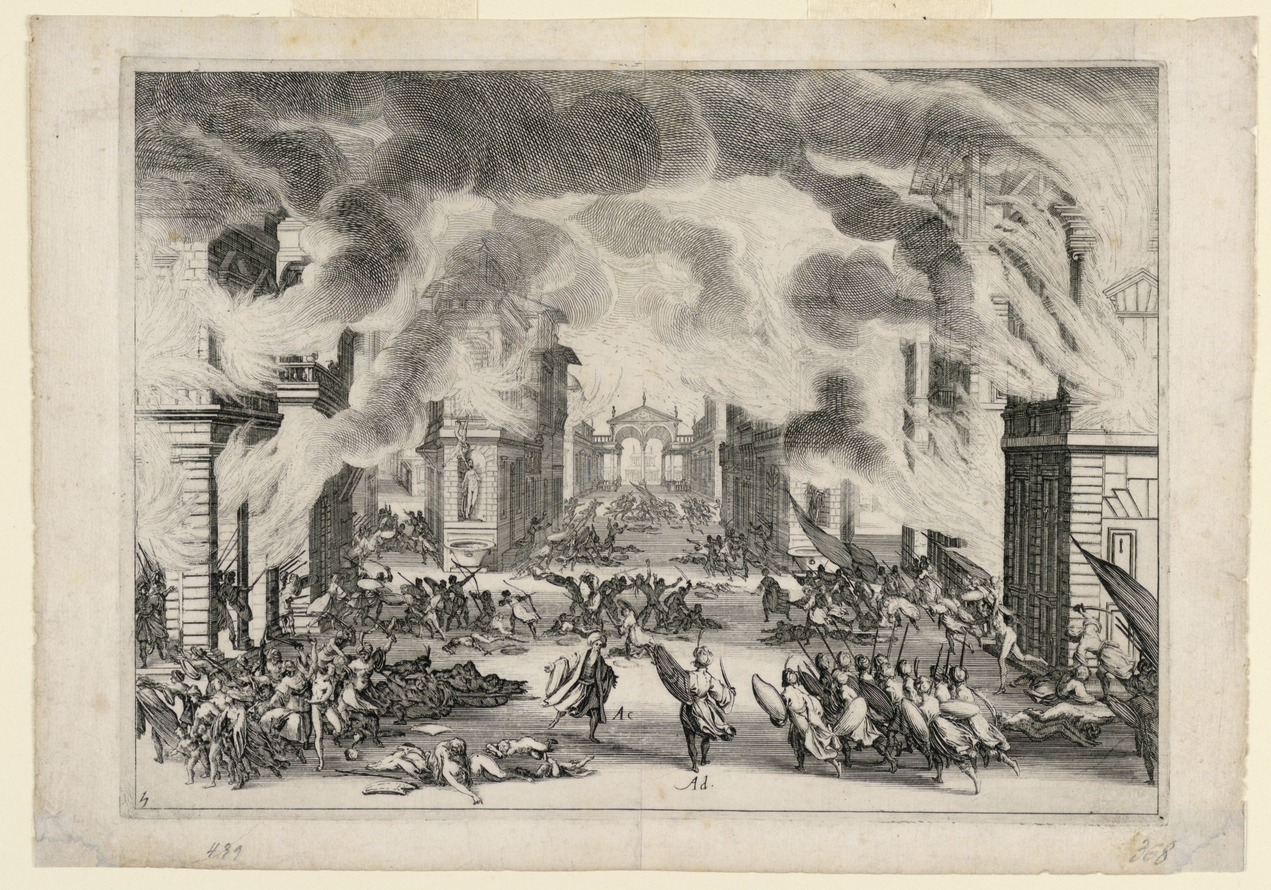 Print, Fourth Act of Soliman; Designed by Jacques Callot; France; engraving with black ink on paper; Platemark: 20.5 × 28.2 cm (8 1/16 × 11 1/8 in.); Museum purchase through gift of Mrs. William G. Fitch; 1962-192-4