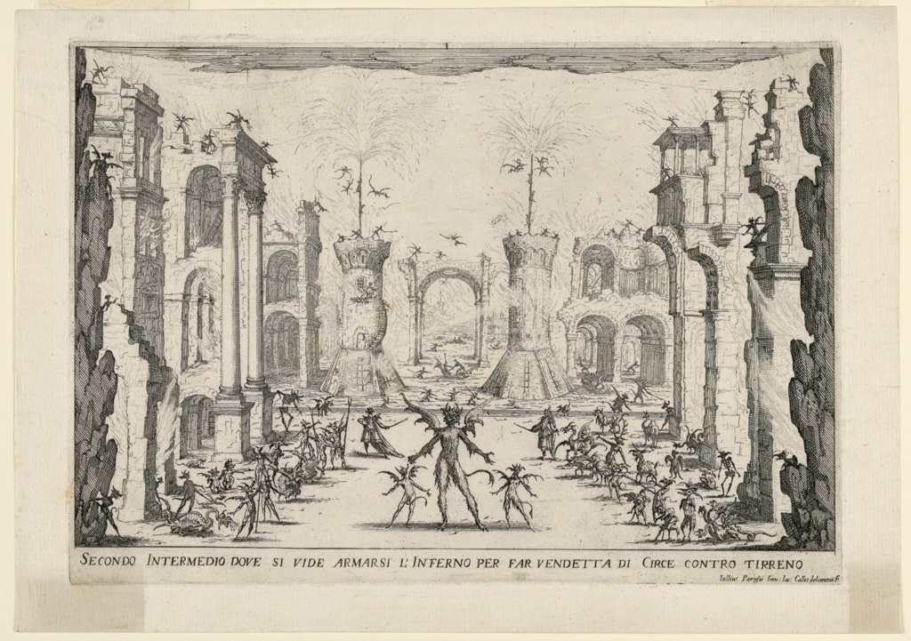 Print, Second Intermezzo, for La Liberazione di Tirenno e. D'Arnea; Written by Andrea Salvadori (Italian, 1591–1634); Designed by Jacques Callot; After Giulio Parigi (Italian, 1571–1635); France; engraving with black ink on paper; Platemark: 20.3 × 29 cm (8 in. × 11 7/16 in.); Museum purchase through gift of Mrs. William G. Fitch; 1962-192-5