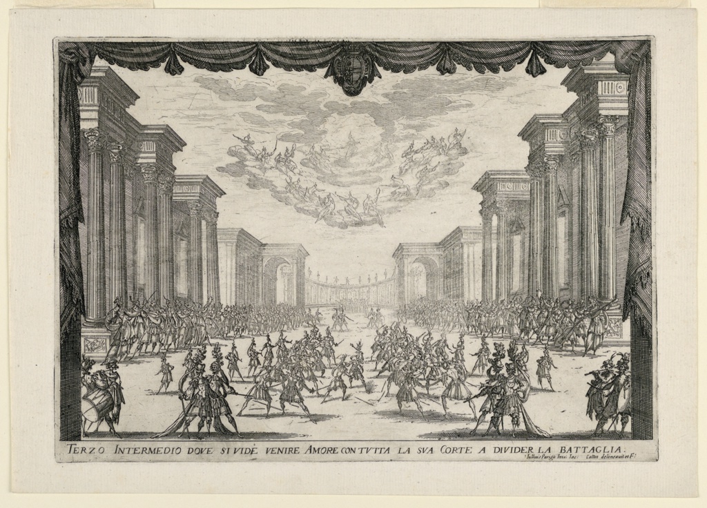 Print, Third Intermezzo, The Battle is Stopped by Love's Arrival with her Cortege; Designed by Jacques Callot; After Giulio Parigi (Italian, 1571–1635); France; engraving in black ink on paper; Platemark: 20.5 × 29 cm (8 1/16 × 11 7/16 in.); Museum purchase through gift of Mrs. William G. Fitch; 1962-192-6