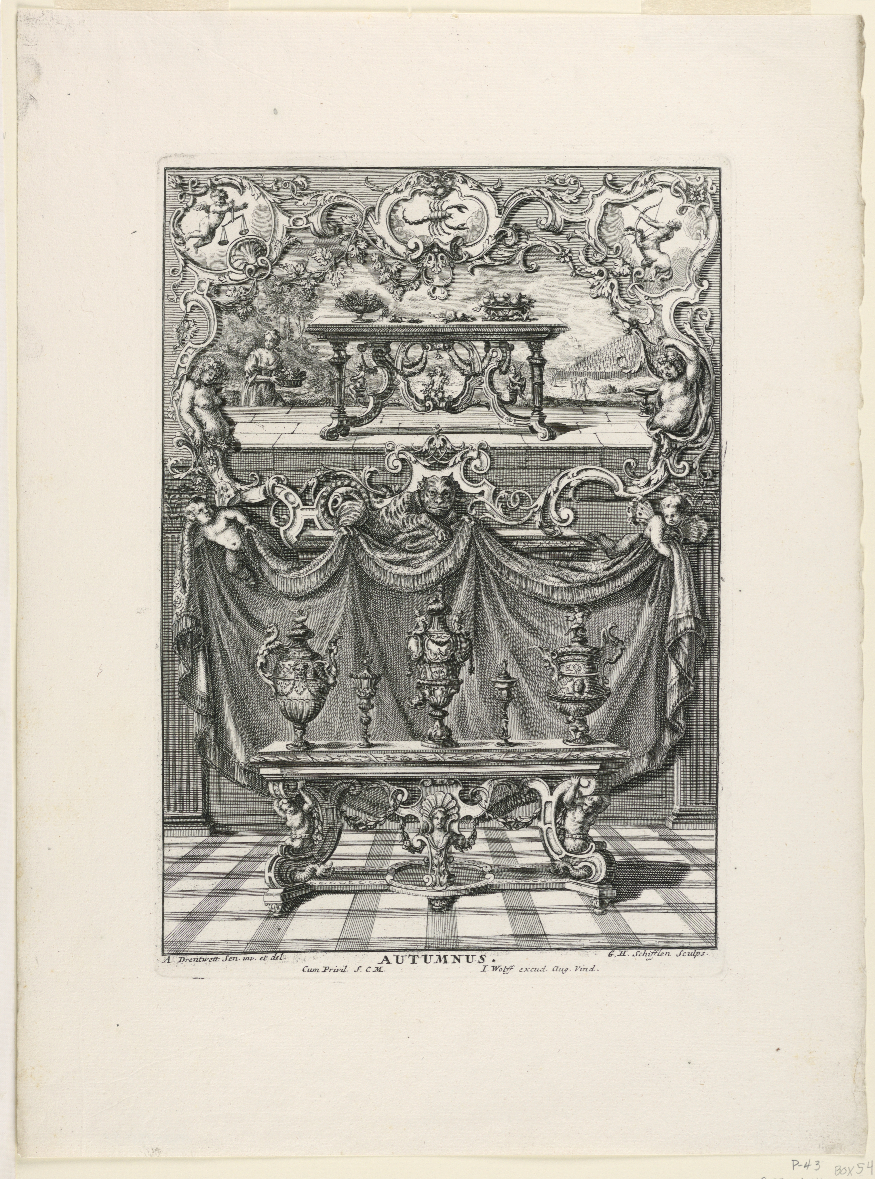 Print, Unterschiedlich Augspurgische Goldschmidts Arbeit, "Autumnus", Plate 3; Designed by Abraham Drentwet (1647 – 1727); Printed by Georg Heinrich Schifflen (German, 1666 – 1745); Published by Jeremias Wolff (German, 1663–1750); Germany; engraving; Museum purchase through gift of Mrs. J.G.K. Duer; 1962-198-33