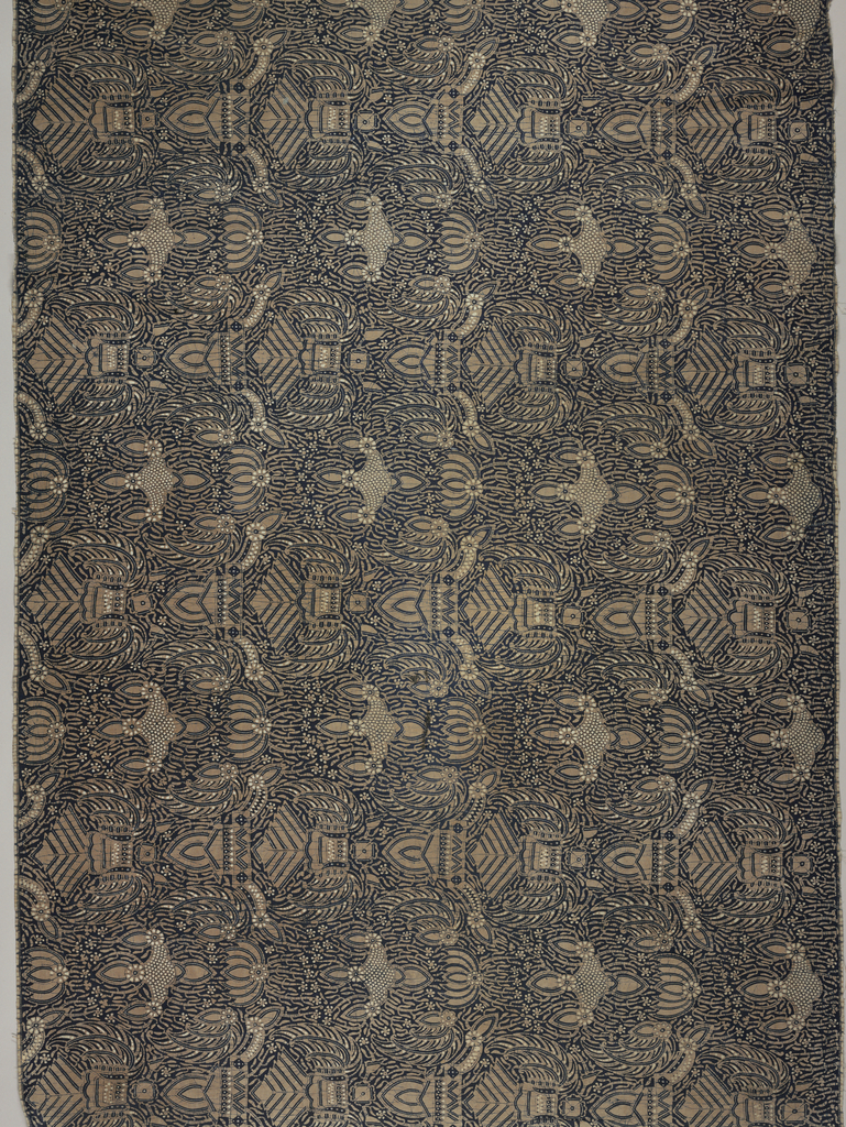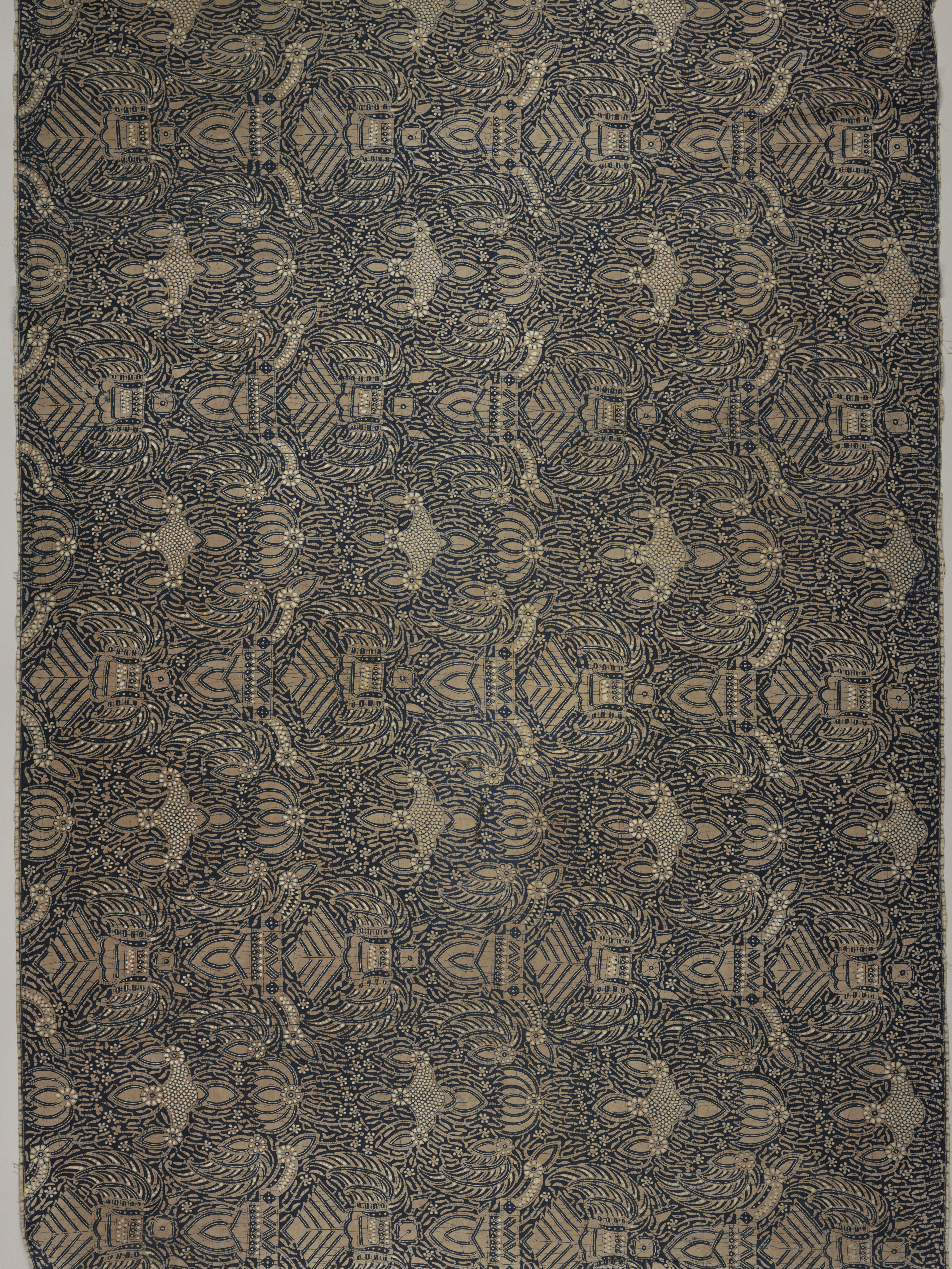 This is a Kain panjang (long sarong). It is dated 19th century and we acquired it in 1962. Its medium is cotton and its technique is wax resist dyeing (batik) on plain weave. It is a part of the Textiles department.
