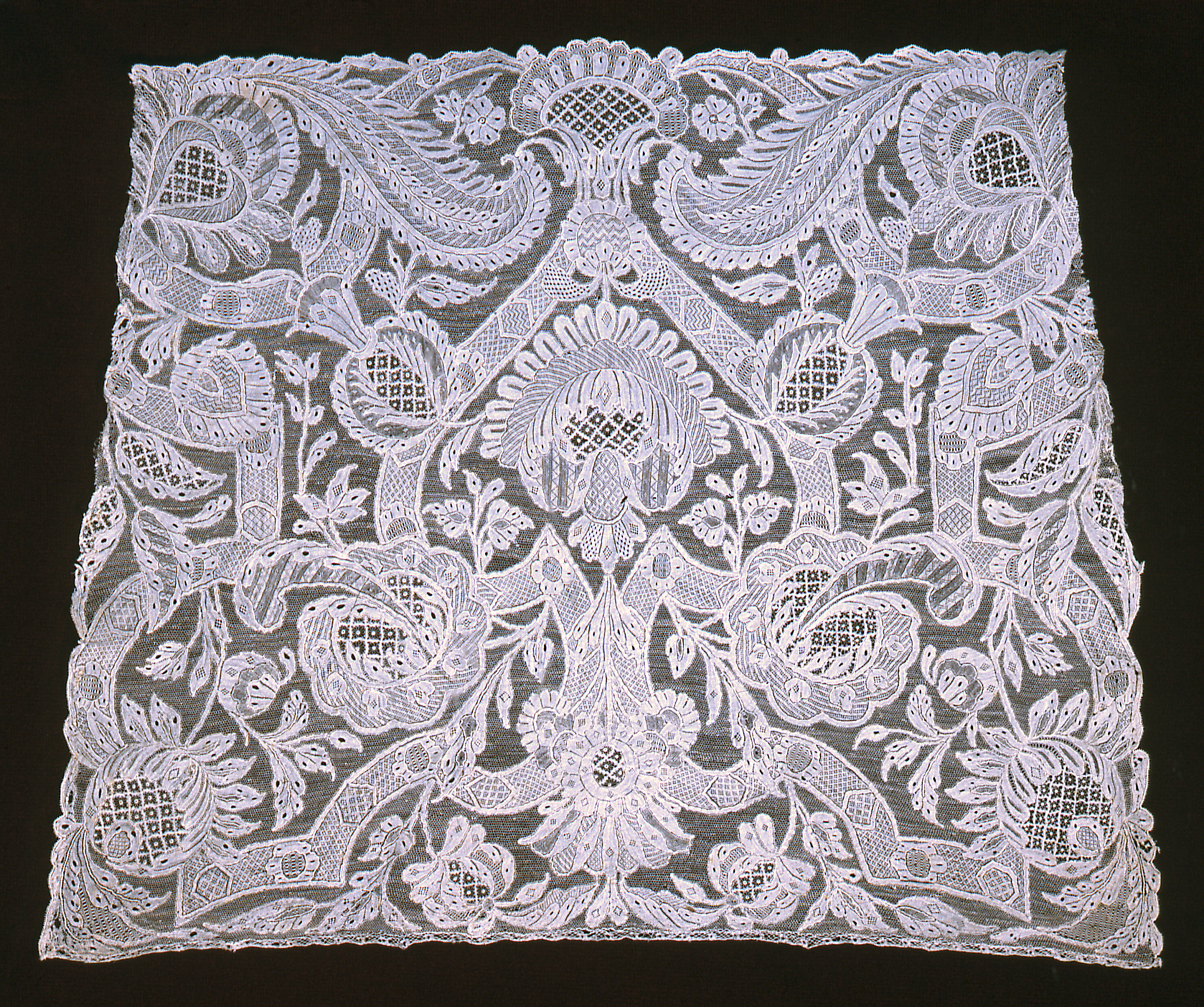 This is a Cravat end. It is dated 1700–1750 and we acquired it in 1962. Its medium is linen and its technique is needle lace with ground of loop and twist with twist return. It is a part of the Textiles department.
