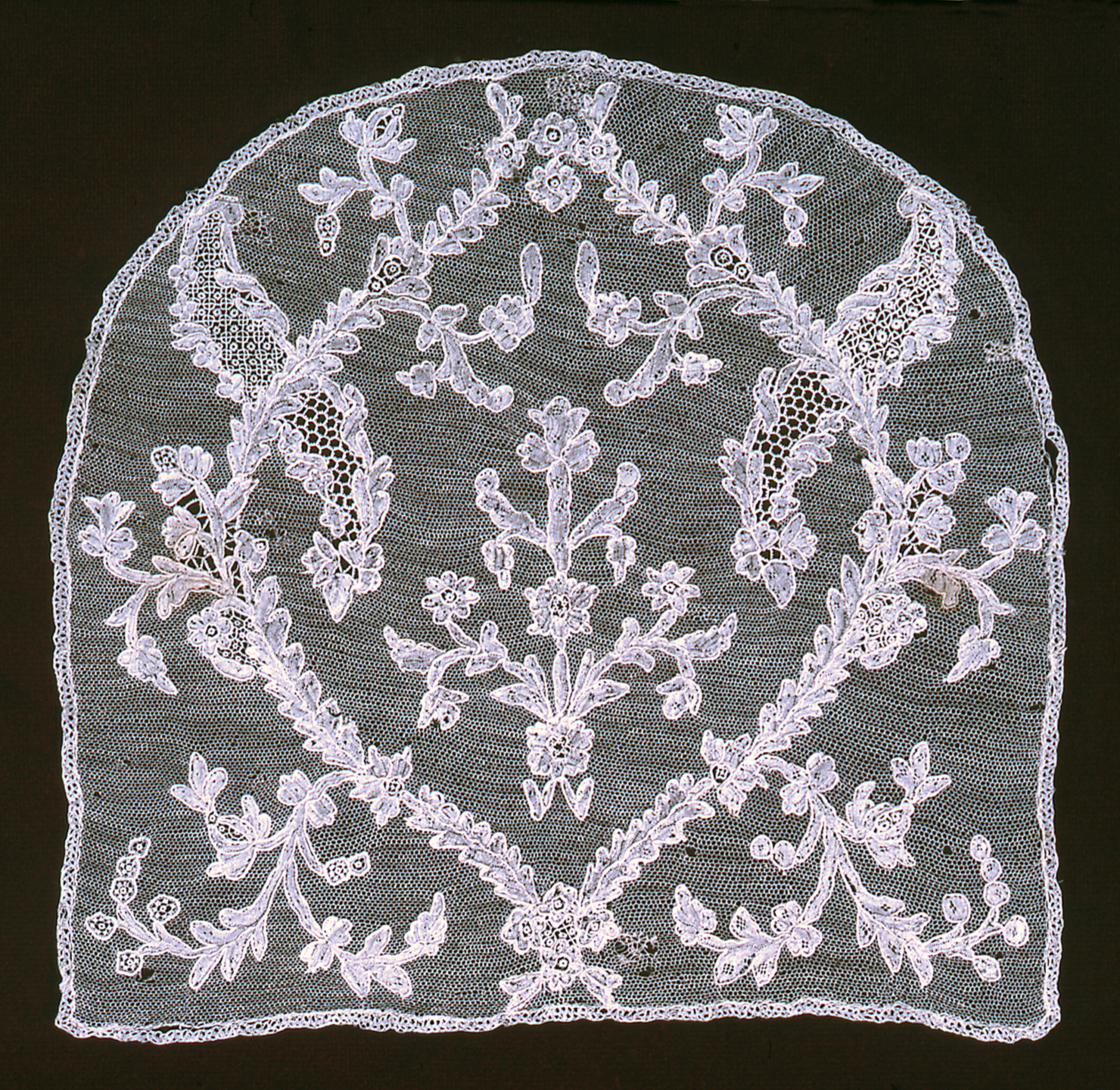 This is a Cap crown. It is dated 18th century and we acquired it in 1962. Its medium is linen and its technique is needle lace with a ground of loop & twist with twist return. It is a part of the Textiles department.