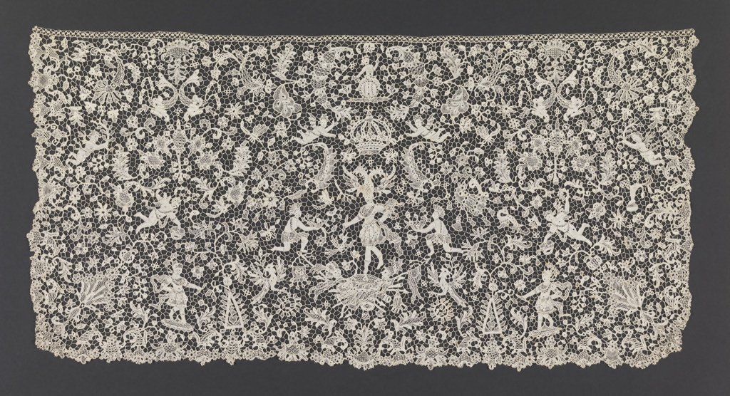 This cravat end is believed to have been made to celebrate the marriage of the Duke of Burgundy (1682–1712) to Marie-Adélaïde of Savoy (1685–1712) in 1697. The central figure is a warrior in Greco-Roman style armor with a helmet suggesting the form of a double-headed eagle. Above him is a large closed crown flanked by cherubs, a symbol of sovereignty which suggests that the figure is very likely the Duke of Burgundy, grandson of Louis XIV. Crouched on either side of him are his brothers, the Duke of Anjou and the Duke of Berry. At the top, two pairs of dolphins lend further evidence that this lace commemorated the marriage of the Dauphin of France.