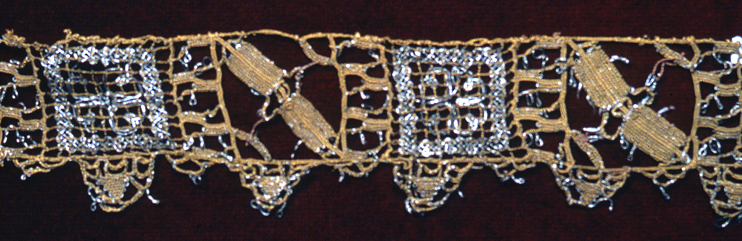 This is a Border. It is dated mid 16th – 17th century and we acquired it in 1962. Its medium is linen, metallic thread and its technique is needle lace with filet and needle interlacings. It is a part of the Textiles department.