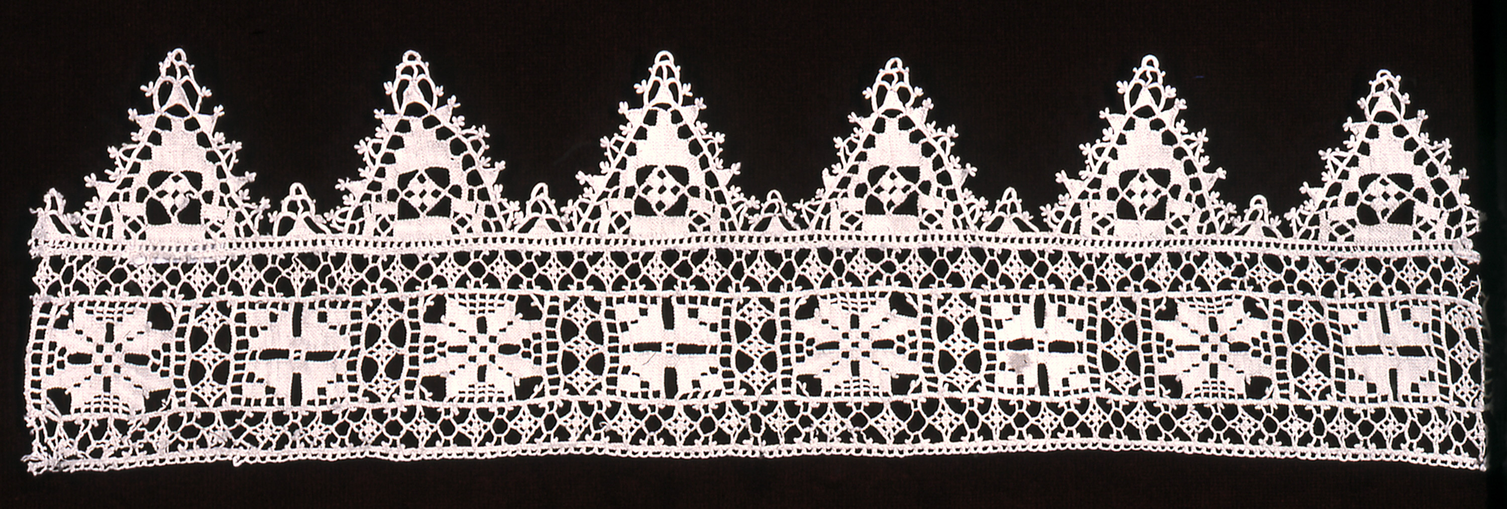 This is a Border. It is dated 17th century and we acquired it in 1962. Its medium is linen and its technique is needle knotting. It is a part of the Textiles department.