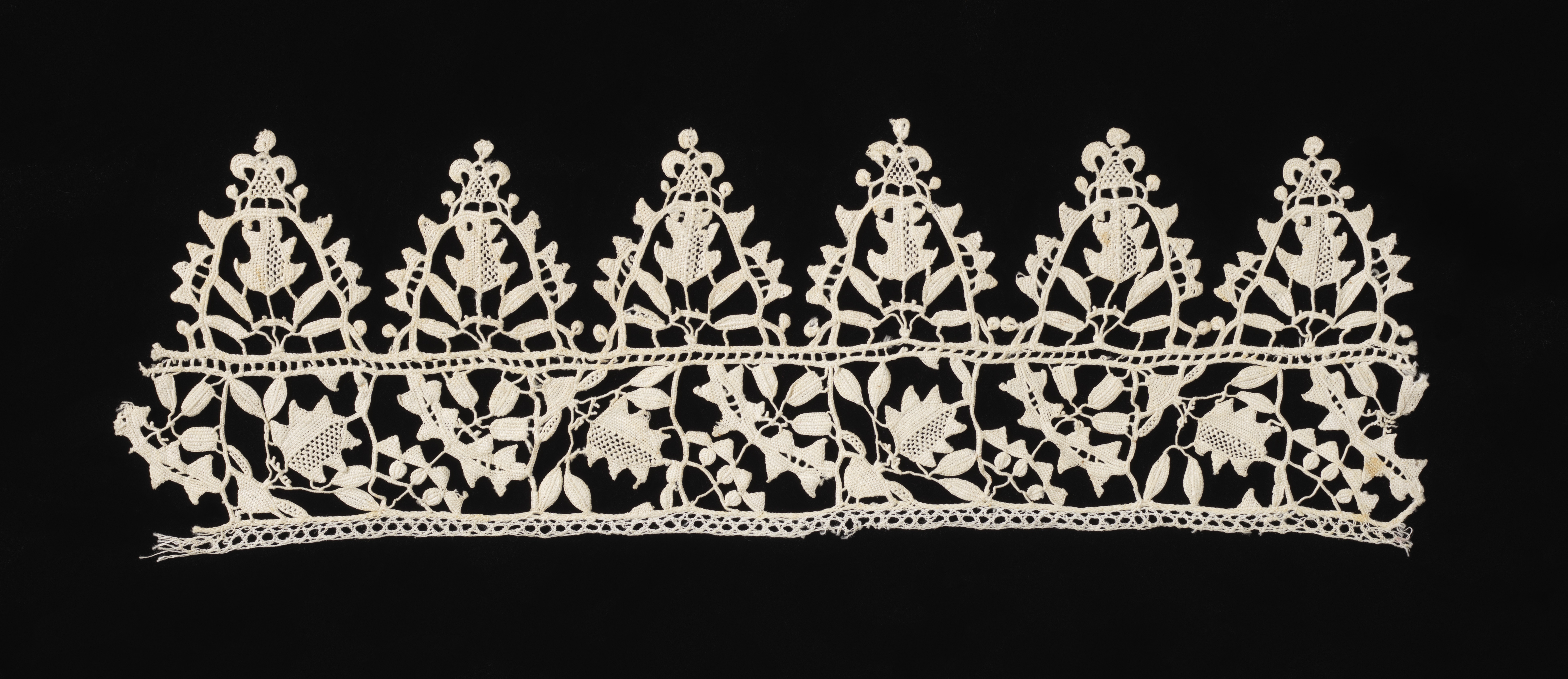 This is a Border. It is dated late 16th–early 17th century and we acquired it in 1962. Its medium is linen and its technique is grid of laid cords with needle lace (reticella style), edge of punto in aria. It is a part of the Textiles department.