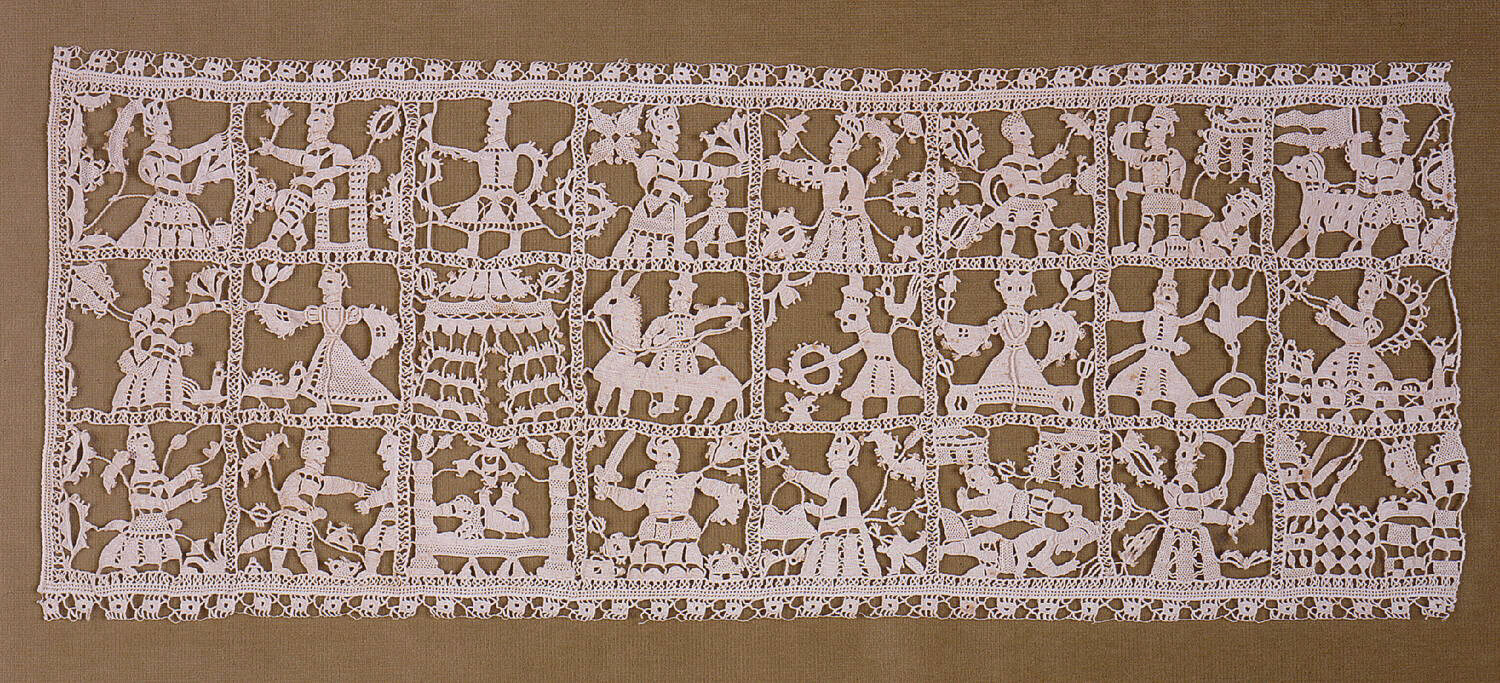 The grid format of the lace was created by removing most of the threads from a fabric substrate. A series of embroidery stitches was built up over the remaining framework to create the design. The resulting look is delicate, almost like a line drawing. The scenes are of Judith and Holofernes, attacker of her people, and displaying his head on the city walls.