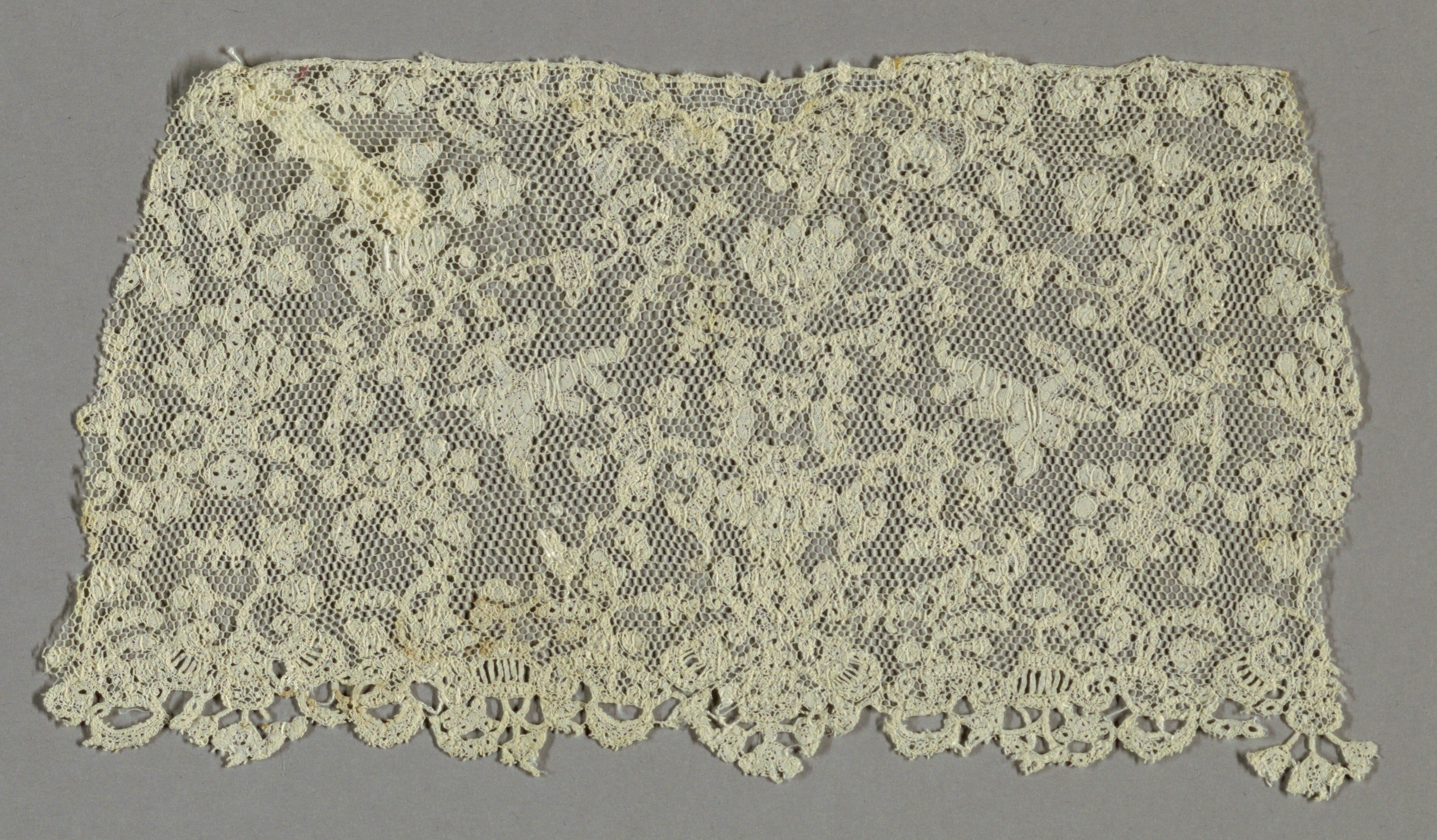 This is a Border fragment. It is dated late 17th–early 18th century and we acquired it in 1962. Its medium is linen and its technique is bobbin made continuous tape with net added. It is a part of the Textiles department.