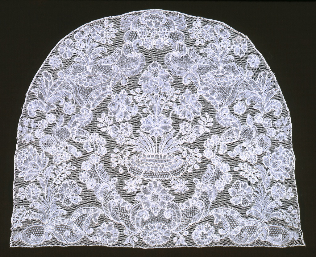 This is a Cap crown. It is dated 18th century and we acquired it in 1962. Its medium is linen and its technique is bobbin lace, brussels style. It is a part of the Textiles department.