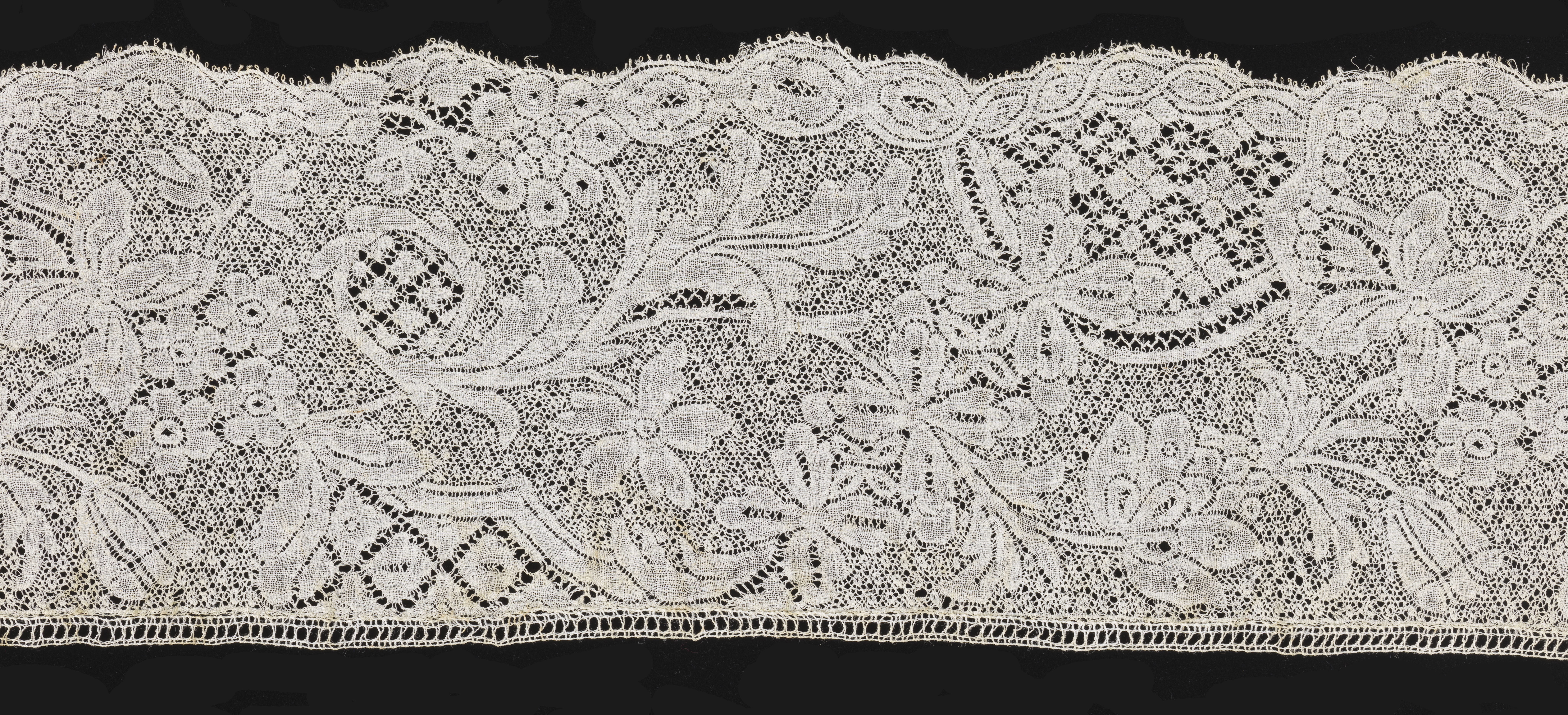 This is a Border. It is dated mid-18th century and we acquired it in 1962. Its medium is linen and its technique is bobbin lace, binche style with snowflake ground. It is a part of the Textiles department.