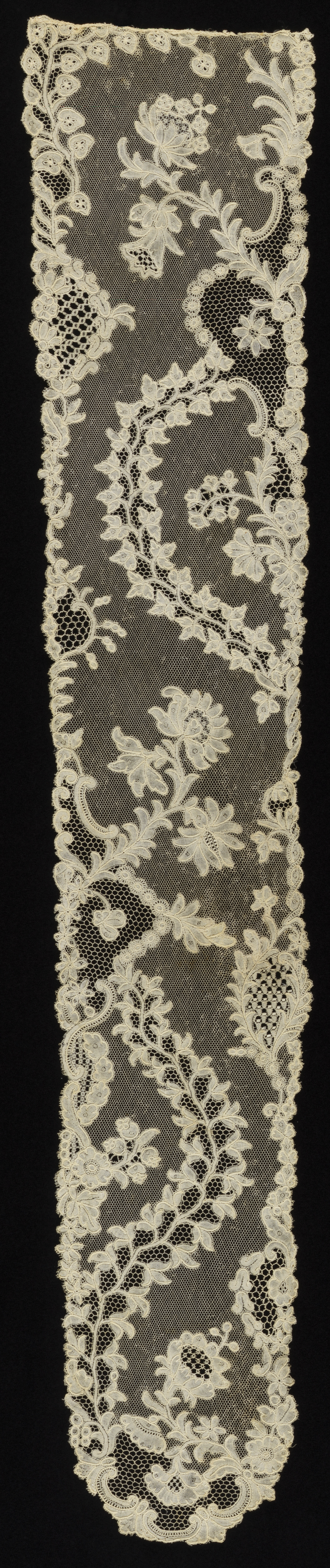 This is a Cap streamers. It is dated 1700–1750 and we acquired it in 1962. Its medium is linen and its technique is bobbin lace, brussels style. It is a part of the Textiles department.
