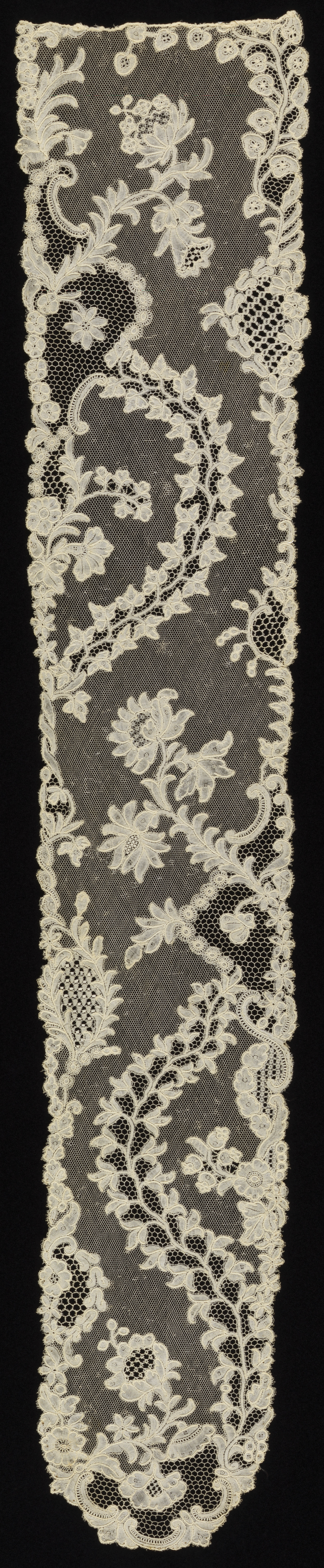 This is a Cap streamers. It is dated 1700–1750 and we acquired it in 1962. Its medium is linen and its technique is bobbin lace, brussels style. It is a part of the Textiles department.
