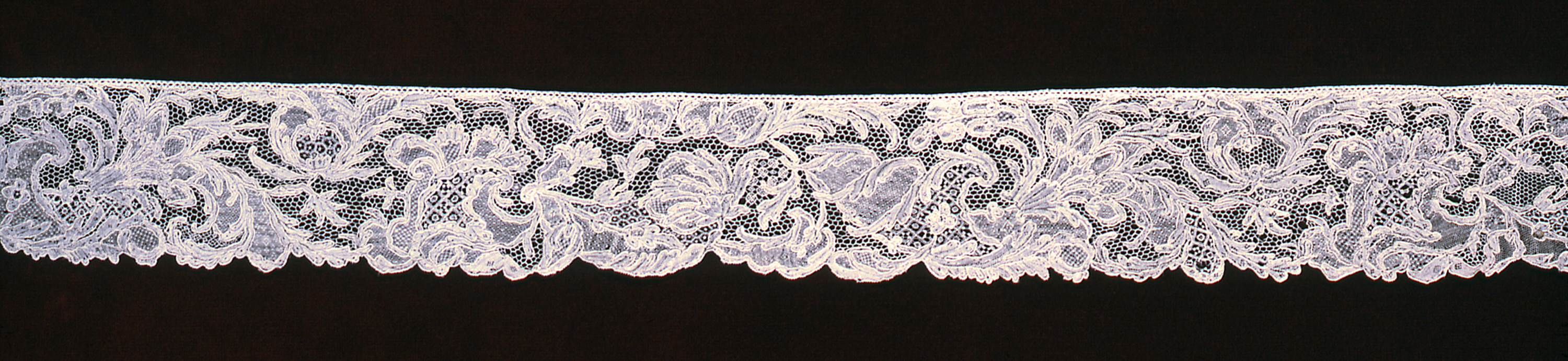 This is a Border. It is dated 1700–1750 and we acquired it in 1962. Its medium is linen and its technique is needle lace with 6 sided reworked lace. It is a part of the Textiles department.