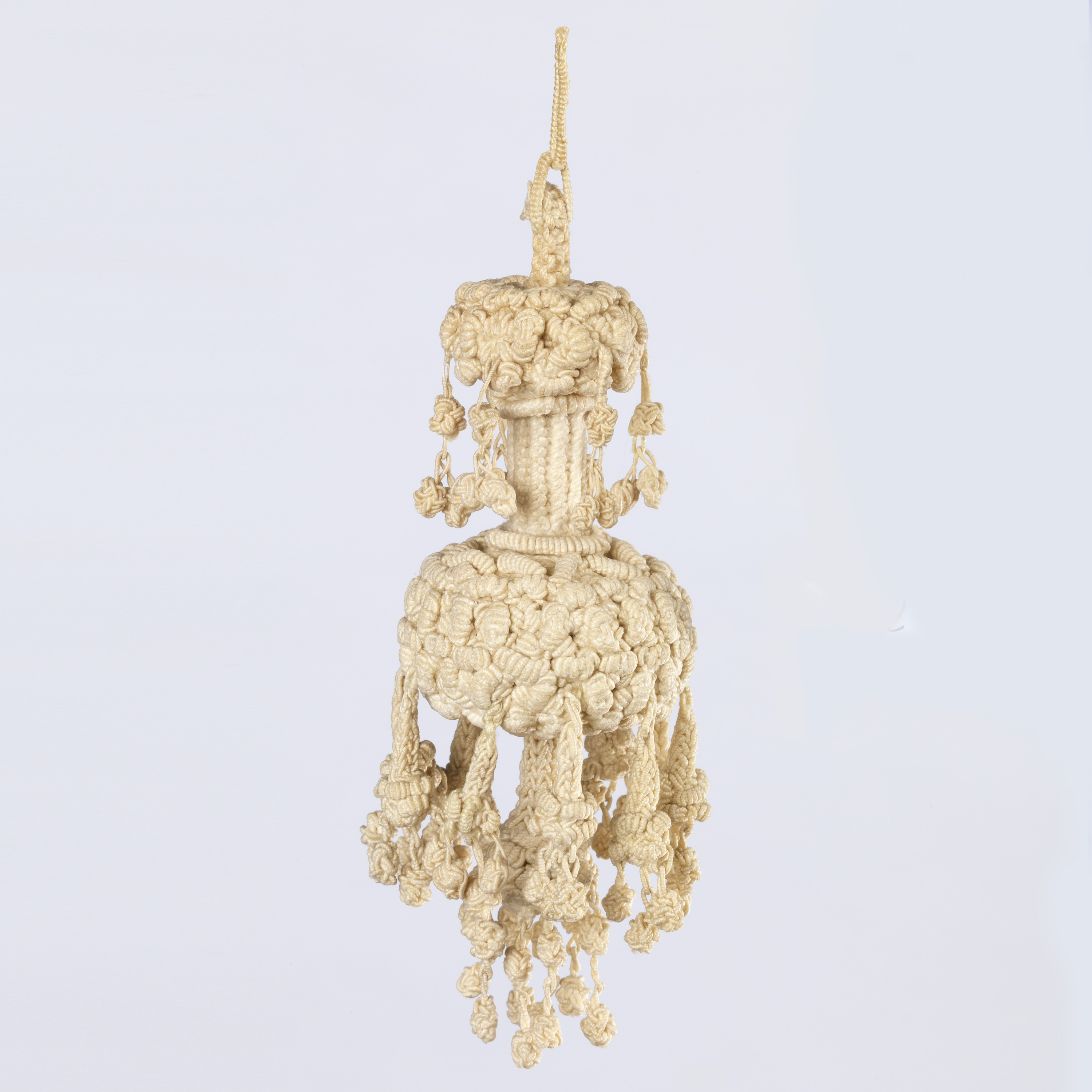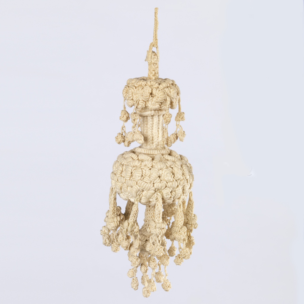 This is a Tassel. It is dated 17th century and we acquired it in 1962. Its medium is linen, metal wire, metal sequins, wooden core and its technique is braided and knotted. It is a part of the Textiles department.