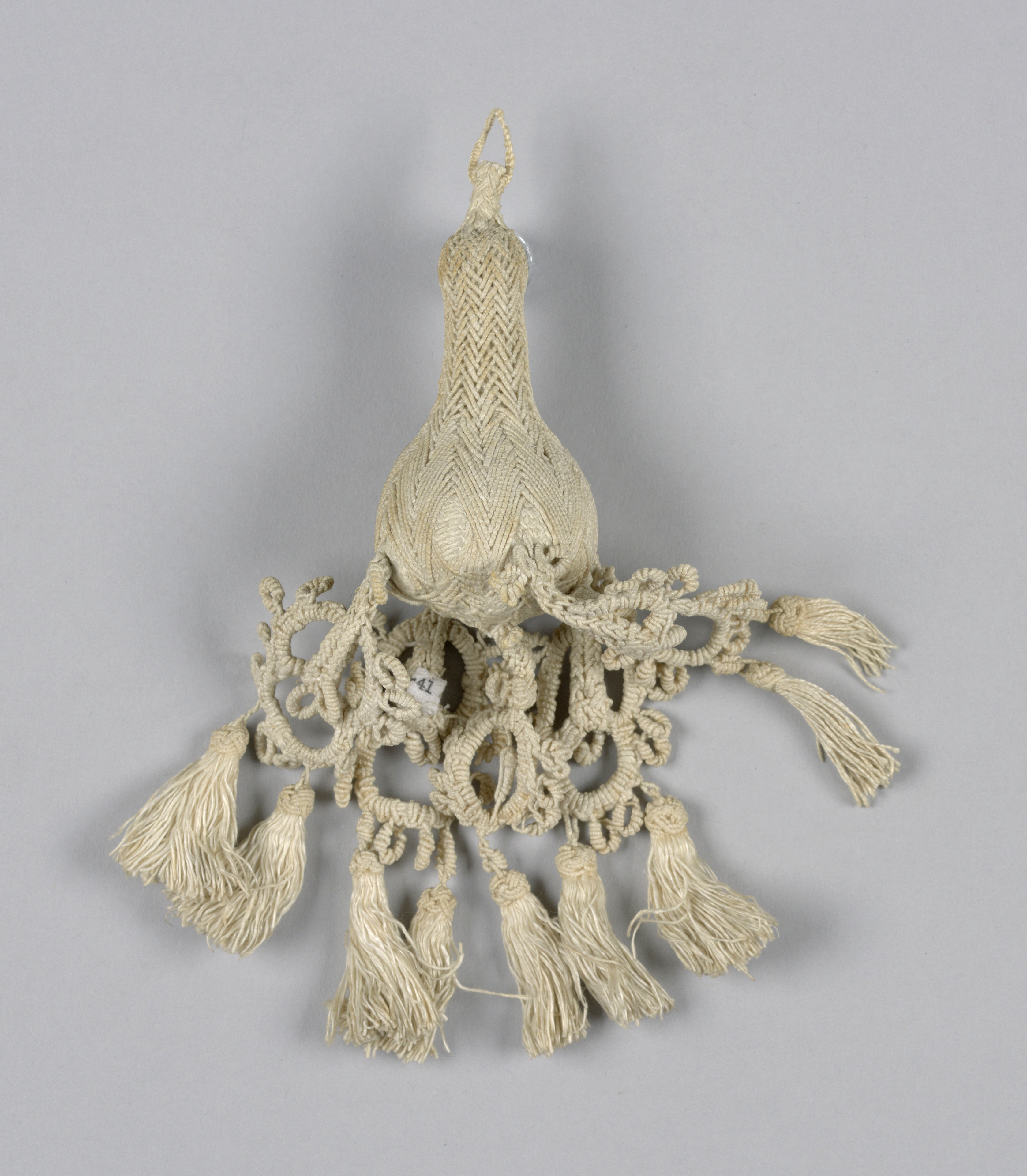 This is a Tassel. It is dated 17th century and we acquired it in 1962. Its medium is linen and its technique is braided and knotted. It is a part of the Textiles department.