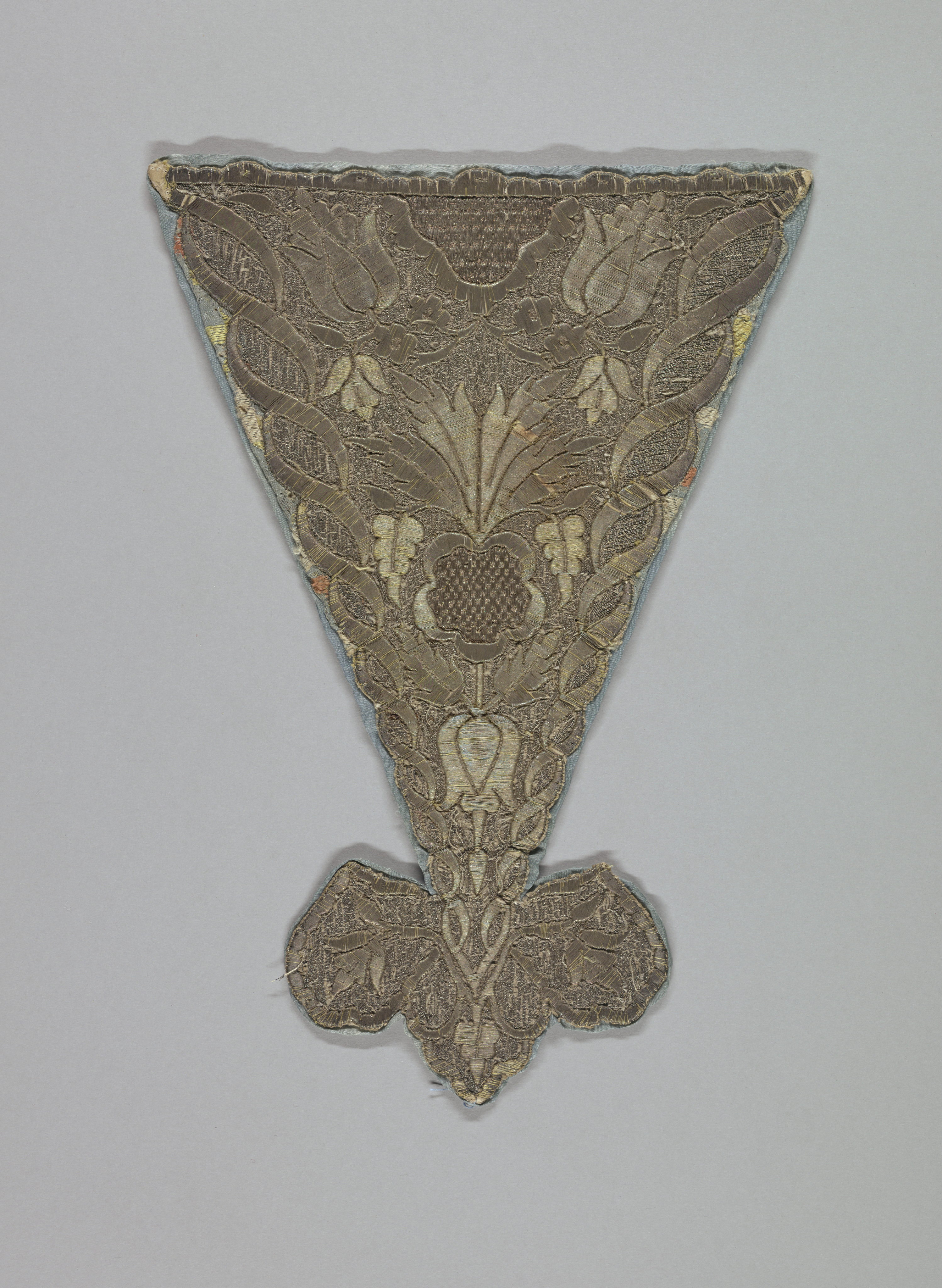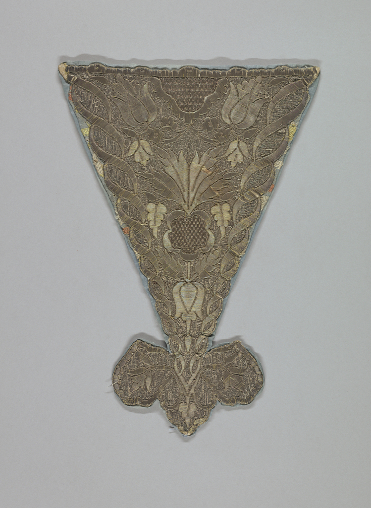 This is a Stomacher. It is dated mid-18th century and we acquired it in 1962. Its medium is silk, metallic, paperboard and its technique is embroidered. It is a part of the Textiles department.