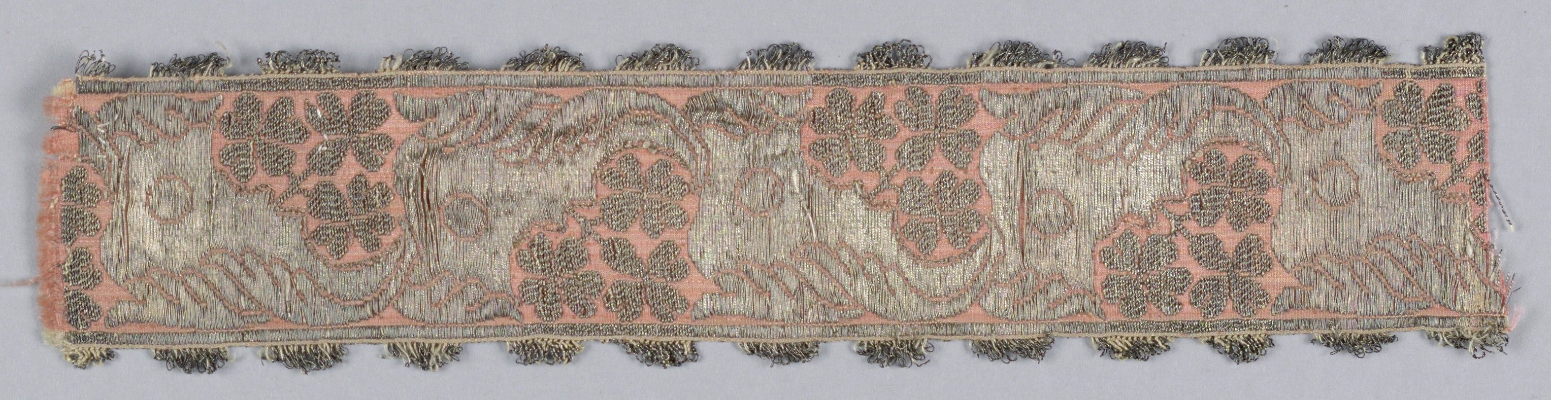 This is a Ribbon. It is dated mid- 18th century and we acquired it in 1962. Its medium is silk, metallic thread. It is a part of the Textiles department.