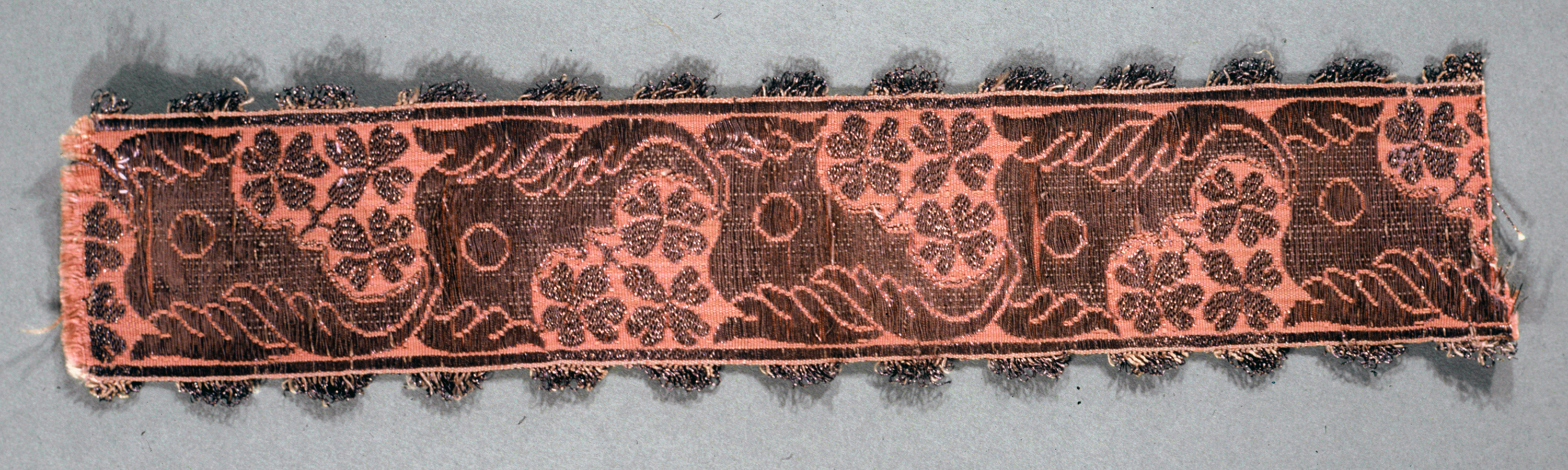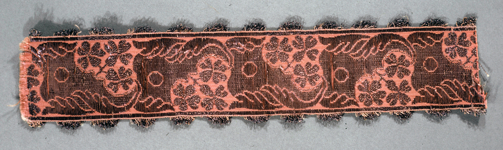 This is a Ribbon. It is dated mid- 18th century and we acquired it in 1962. Its medium is silk, metallic thread. It is a part of the Textiles department.