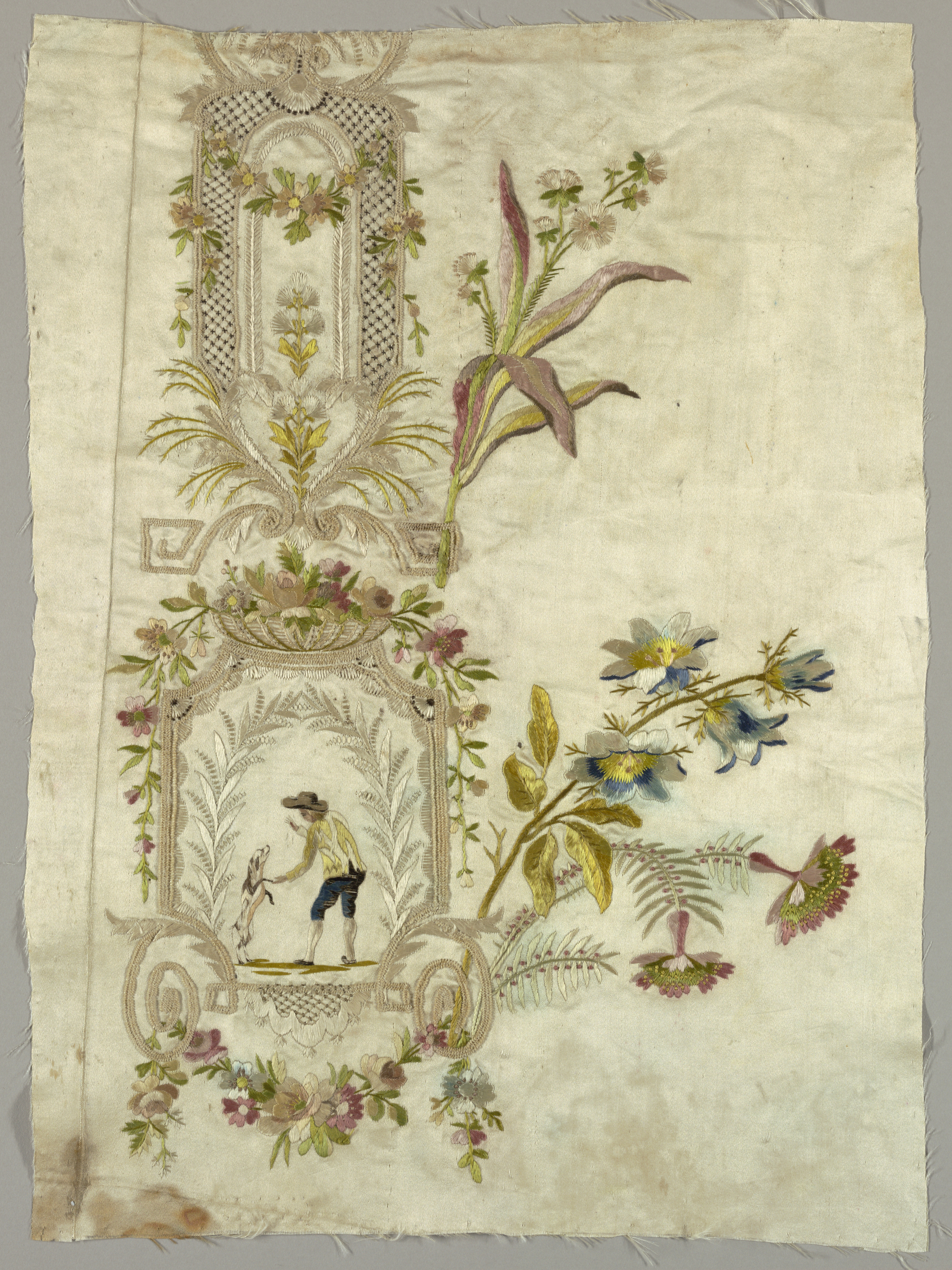 This is a Textile. It is dated mid- 18th century and we acquired it in 1962. Its medium is silk on silk and its technique is embroidered on taffeta. It is a part of the Textiles department.
