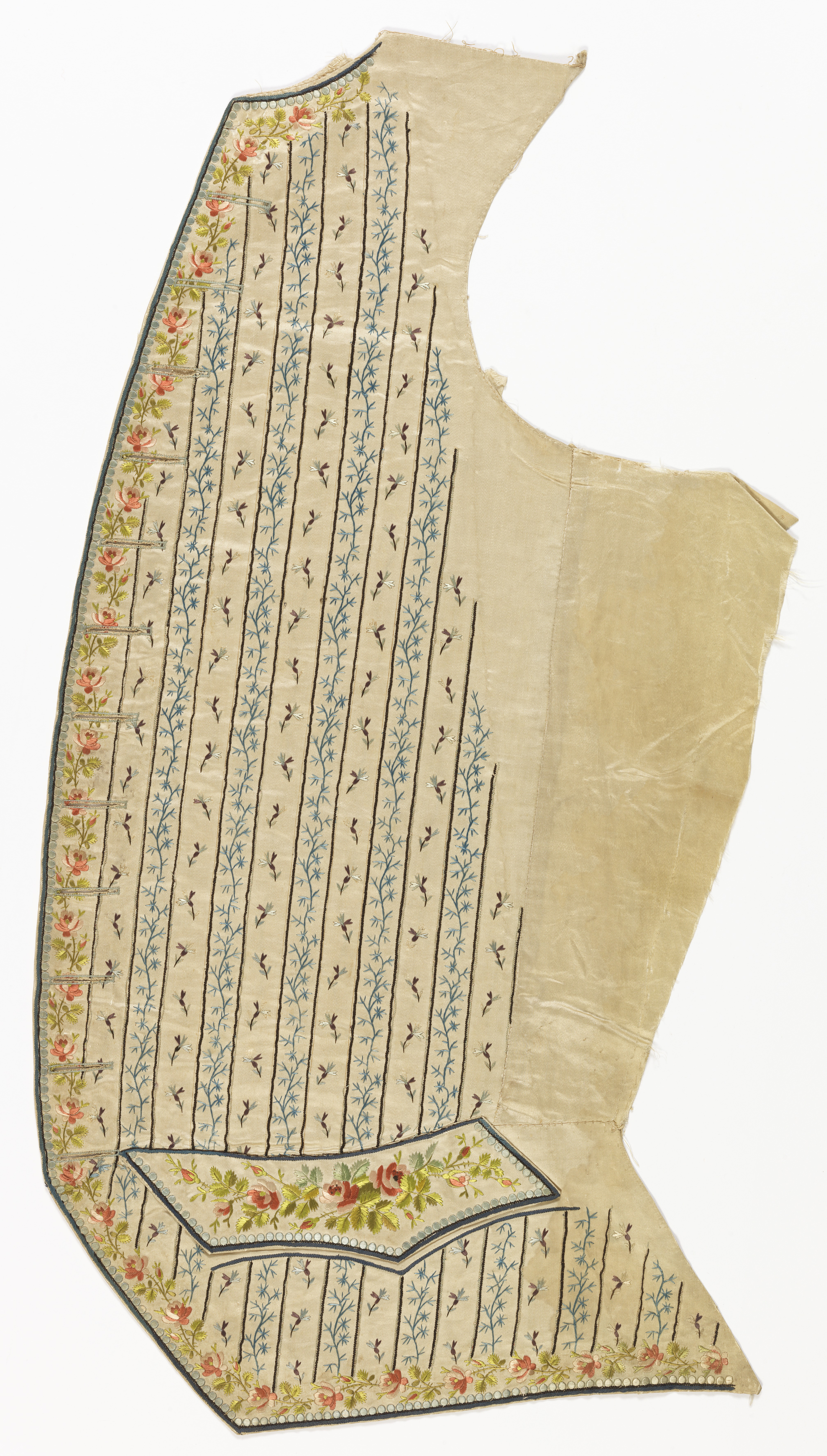 This is a Waistcoat fragments. It is dated late 18th century and we acquired it in 1962. Its medium is silk on silk and its technique is embroidered in satin stitch on satin weave. It is a part of the Textiles department.