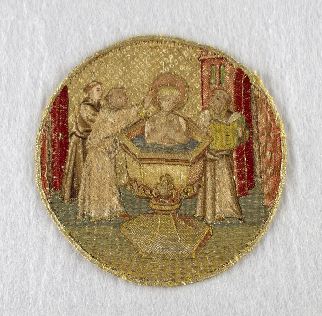 This is a Roundel. It is dated 15th century and we acquired it in 1962. Its medium is silk, metallic threads and its technique is embroidery. It is a part of the Textiles department.