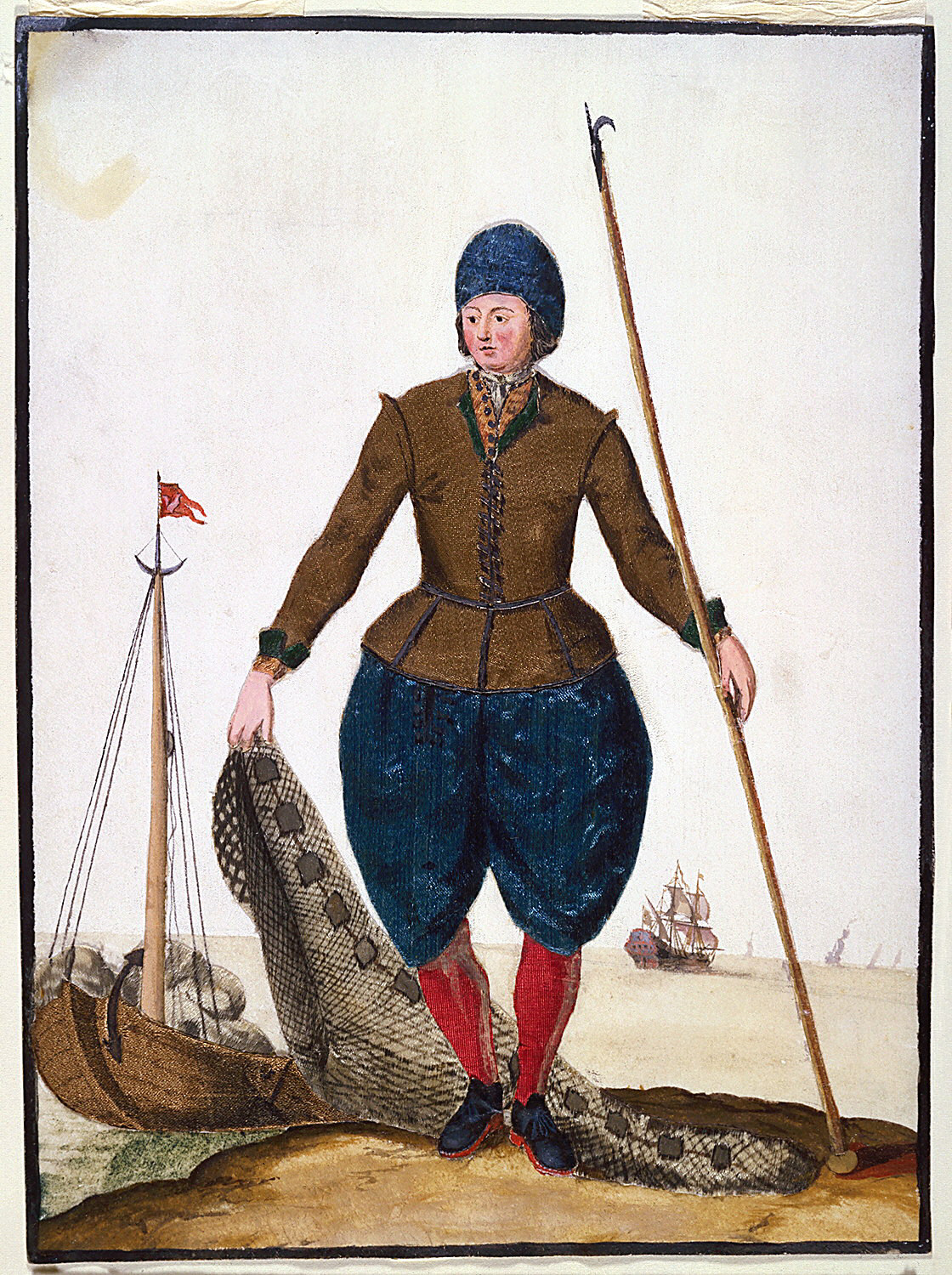 Decoupage, Fisherman with His Tackle; Netherlands; graphite, brush and watercolor on vellum with various fabrics; 24.4 x 17.5 cm (9 5/8 x 6 7/8 in.); Gift of Elizabeth M. Riley; 1963-33-1