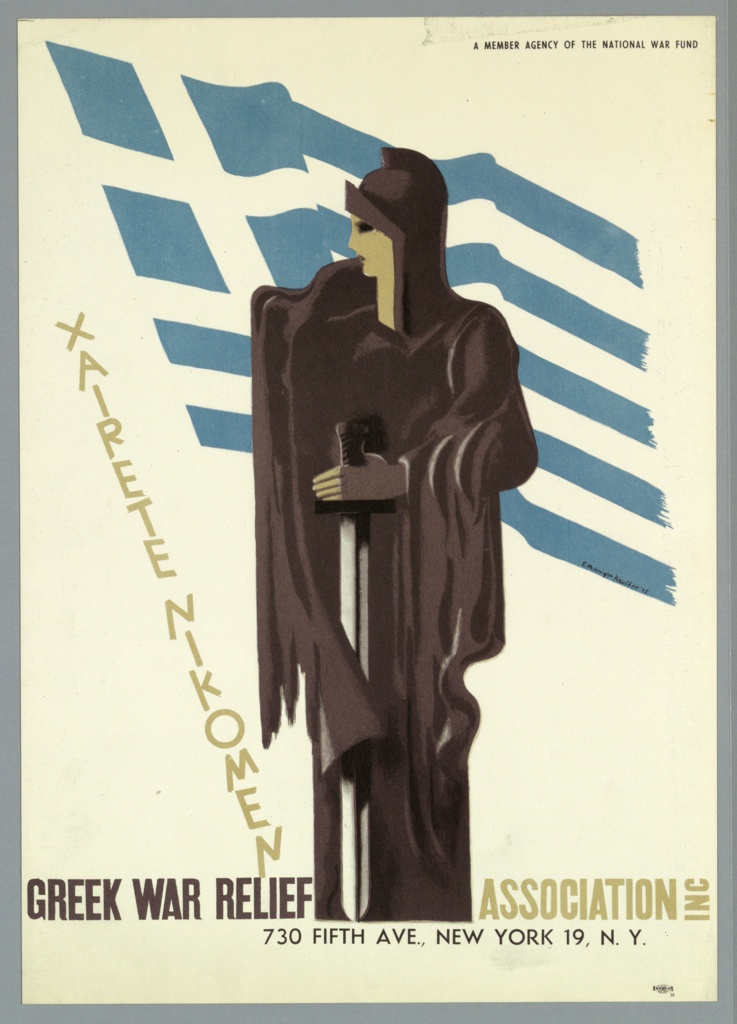 Poster, Xairete Nikomen; Designed by Edward McKnight Kauffer (American, active England, 1890–1954); Client: National War Fund; USA; lithograph on paper, lined; 39.3 × 27.7 cm (15 1/2 × 10 7/8 in.); Gift of Mrs. E. McKnight Kauffer; 1963-39-110-b