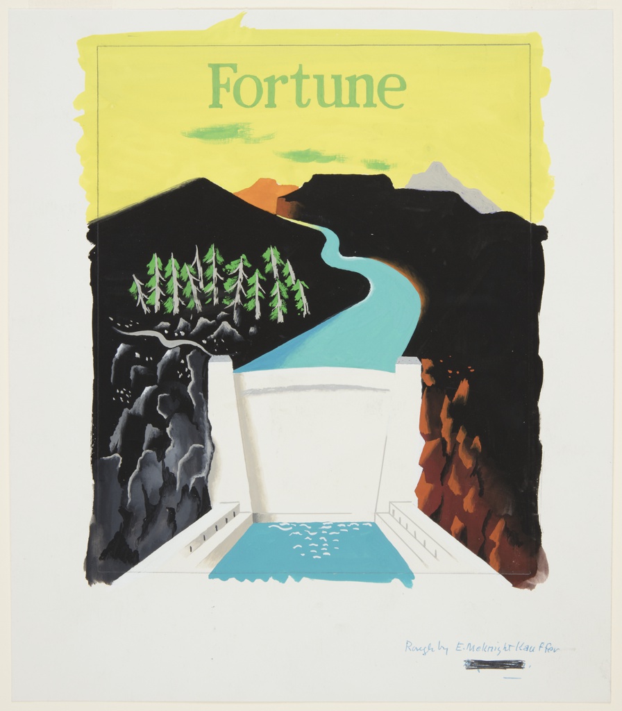 Drawing, Design for Fortune, Dam and River; Designed by Edward McKnight Kauffer (American, active England, 1890–1954); Client: Fortune; USA; brush and gouache, graphite on paper; 32.1 × 28.4 cm (12 5/8 × 11 3/16 in.); Gift of Mrs. E. McKnight Kauffer; 1963-39-1215
