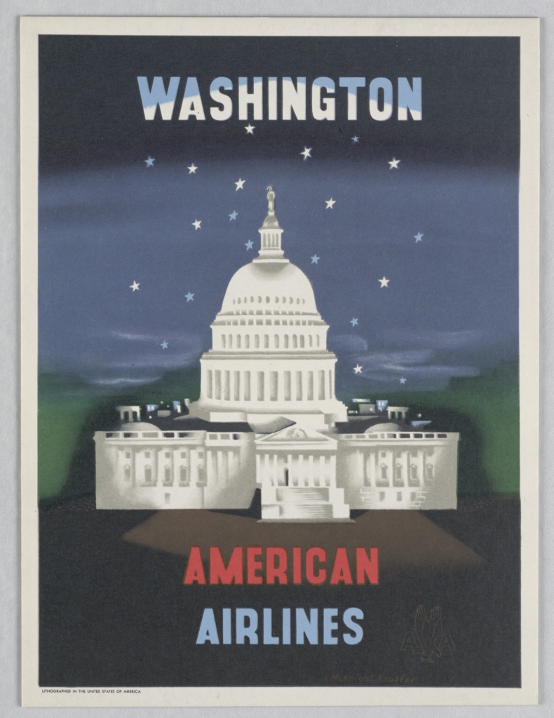 Print, Washington; Designed by Edward McKnight Kauffer (American, active England, 1890–1954); Client: American Airlines (United States); USA; offset lithograph on paper, mounted on board; 24.4 × 18.4 cm (9 5/8 × 7 1/4 in.); Gift of Mrs. E. McKnight Kauffer; 1963-39-164-i