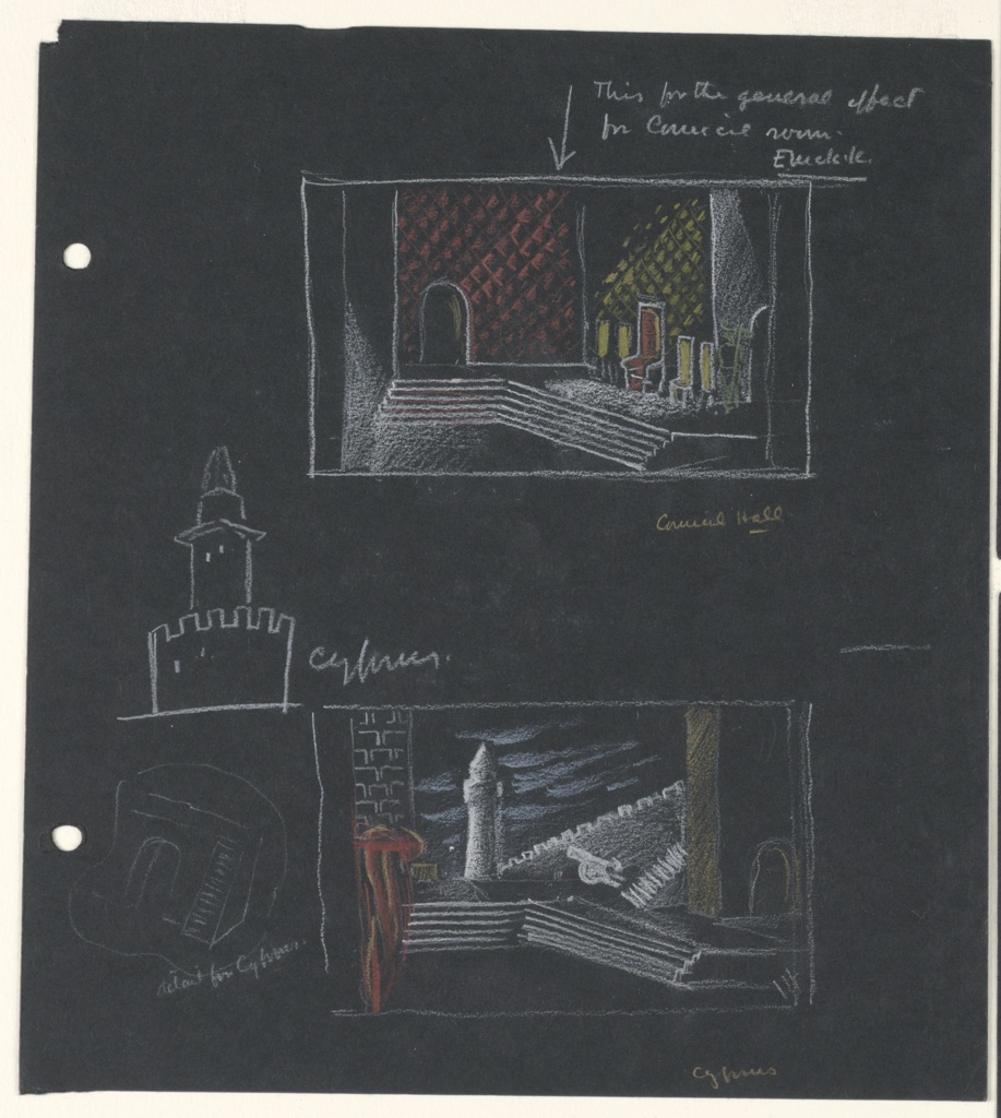 Inscribed in white chalk, upper right: [arrow pointing down] This for the general effect / for Council room; center left: Cyprus.; lower left: detail for Cyprus; in yellow crayon, center right: Council Hall; lower right: Cyprus