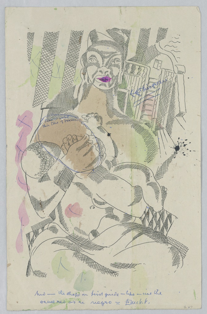 Inscribed in pen and blue ink, at upper right: <–<– This green [underlined twice]; at center left: Please use this / tone of brown; across bottom margin: And — its shape in the first guide — lips — use the / same red as a negro = EMcK.K.