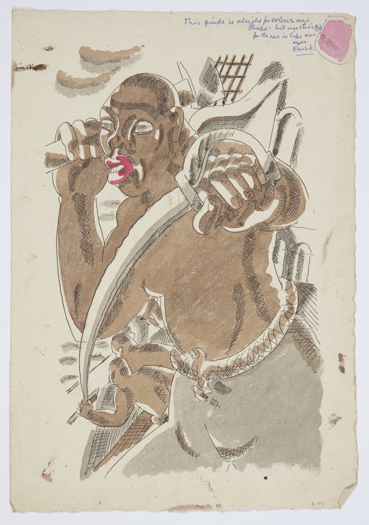 Print, Illustration for Benito Cereno; Written by Herman Melville (American, 1819–1891); Designed by Edward McKnight Kauffer (American, active England, 1890–1954); Printed by The Curwen Press (United Kingdom); Published by Nonesuch Press; USA; offset lithograph, hand-colored additions in brush and brown, gray, and pink watercolor on paper; 30.4 × 21 cm (11 15/16 × 8 1/4 in.); Gift of Mrs. E. McKnight Kauffer; 1963-39-307