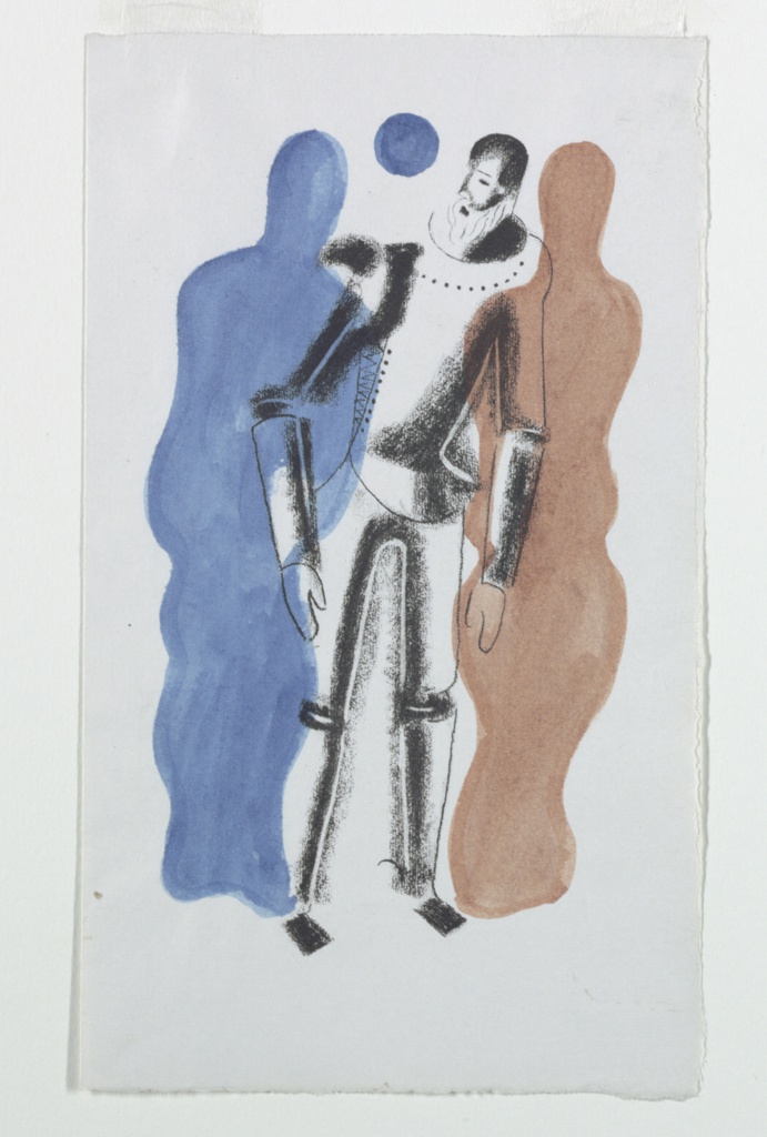 Print, Study for Don Quixote; Written by Miguel de Cervantes (Spanish, 1547–1616); Designed by Edward McKnight Kauffer (American, active England, 1890–1954); Printed by The Curwen Press (United Kingdom); Published by Nonesuch Press; USA; lithograph with hand-colored additions in brush and brown and blue watercolor; 22.9 × 13.3 cm (9 in. × 5 1/4 in.); Gift of Mrs. E. McKnight Kauffer; 1963-39-351-b