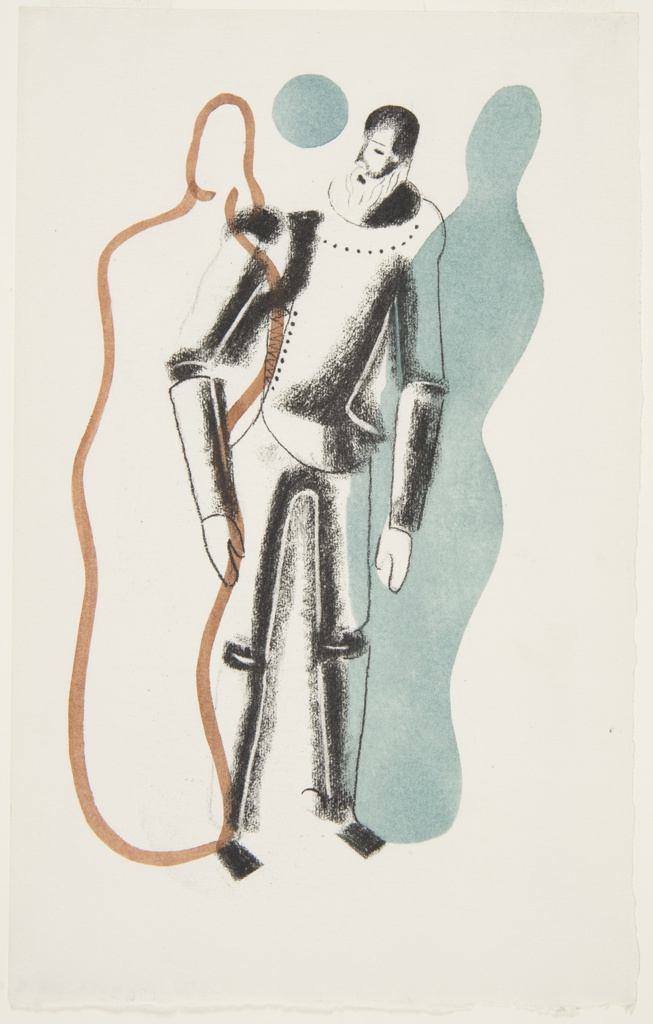 Print, Illustration for Don Quixote; Written by Miguel de Cervantes (Spanish, 1547–1616); Designed by Edward McKnight Kauffer (American, active England, 1890–1954); Printed by The Curwen Press (United Kingdom); Published by Nonesuch Press; USA; offset lithograph, hand-colored additions in brush and brown and blue watercolor on paper; 22.9 × 14.2 cm (9 × 5 9/16 in.); Gift of Mrs. E. McKnight Kauffer; 1963-39-351-c