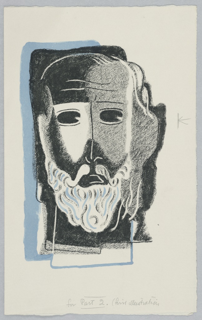 Print, Illustration for Don Quixote; Written by Miguel de Cervantes (Spanish, 1547–1616); Designed by Edward McKnight Kauffer (American, active England, 1890–1954); Printed by The Curwen Press (United Kingdom); Published by Nonesuch Press; USA; offset lithograph, hand-colored additions in brush and blue watercolor on paper; 22.9 × 14.2 cm (9 × 5 9/16 in.); Gift of Mrs. E. McKnight Kauffer; 1963-39-359-a
