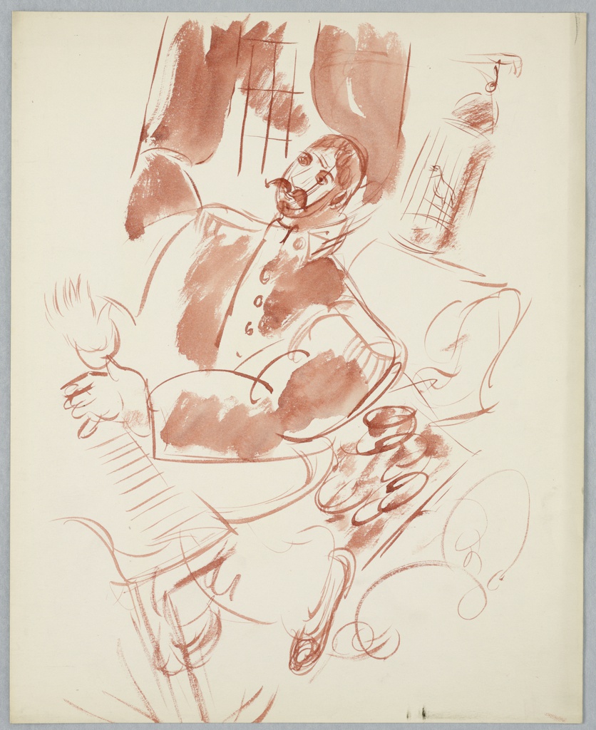Drawing, Illustration for Benia Krik; Designed by Edward McKnight Kauffer (American, active England, 1890–1954); Written by Isaak Emmanuilovich Babel (Russian, 1894–1940); USA; brush and brown watercolor on paper; 34.3 × 27.7 cm (13 1/2 × 10 7/8 in.); Gift of Mrs. E. McKnight Kauffer; 1963-39-409