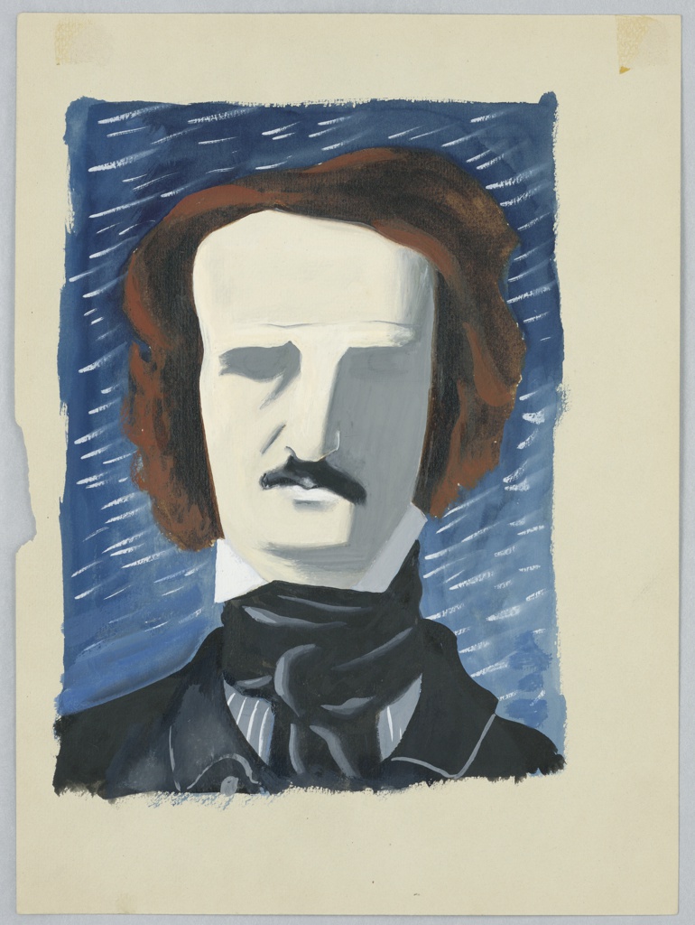 This is a Drawing. It was designed by Edward McKnight Kauffer and written by Edgar Allan Poe and published by Alfred A. Knopf. It is dated 1946 and we acquired it in 1963. Its medium is brush and gouache on paper. It is a part of the Drawings, Prints, and Graphic Design department.