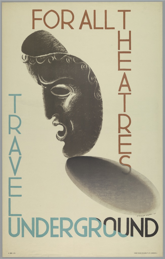 Poster, For All Theaters Travel Underground; Designed by Edward McKnight Kauffer (American, active England, 1890–1954); Printed by Vincent Brooks, Day & Son; Client: Underground Electric Railways of London Company Ltd.; USA; offset lithograph on paper, mounted on board; 101.5 × 63.4 cm (39 15/16 × 24 15/16 in.); Gift of Mrs. E. McKnight Kauffer; 1963-39-46