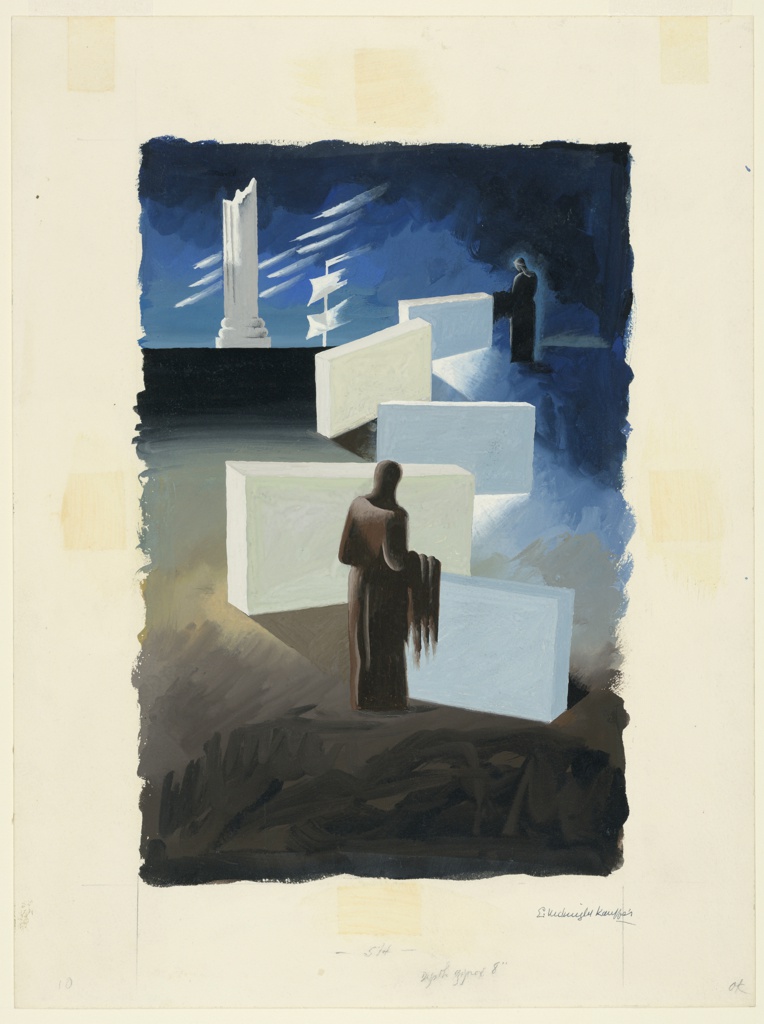 Drawing, Illustration for The Complete Poems and Stories of Edgar Allan Poe; Designed by Edward McKnight Kauffer (American, active England, 1890–1954); Written by Edgar Allan Poe; Published by Alfred A. Knopf; USA; brush and gouache on paper; 40.5 × 30.4 cm (15 15/16 × 11 15/16 in.); Gift of Mrs. E. McKnight Kauffer; 1963-39-464