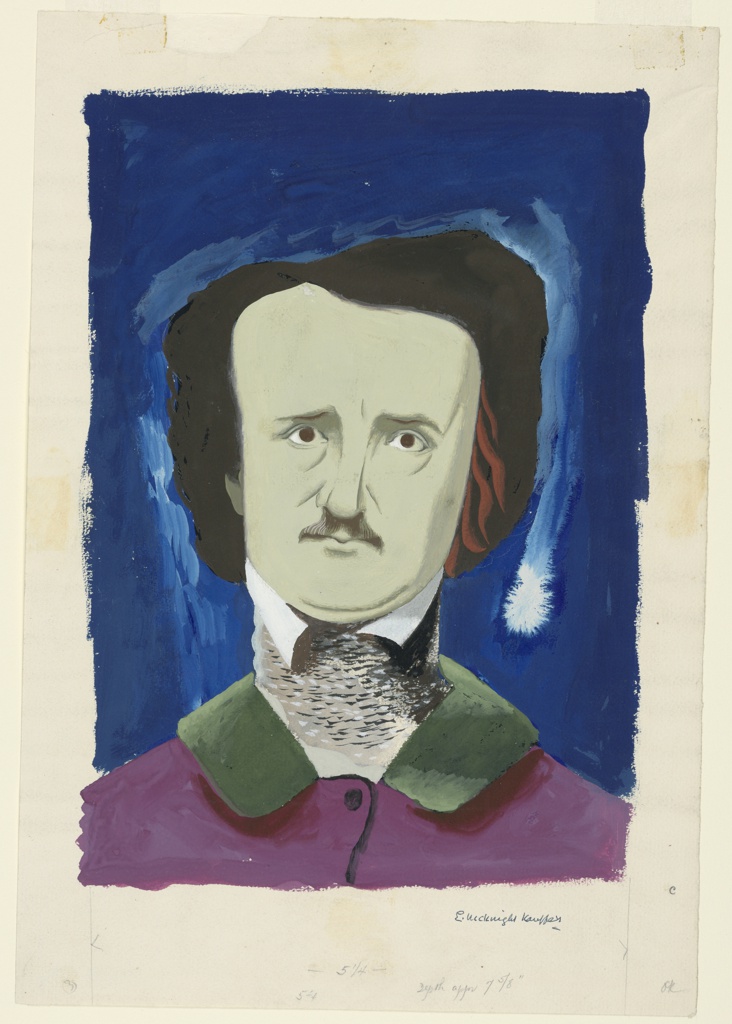This is a Drawing. It was designed by Edward McKnight Kauffer and written by Edgar Allan Poe and published by Alfred A. Knopf. It is dated 1946 and we acquired it in 1963. Its medium is brush and gouache on paper. It is a part of the Drawings, Prints, and Graphic Design department.