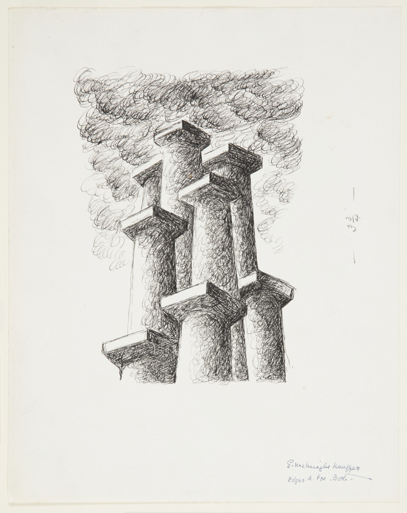 Drawing, Illustration for The Complete Poems and Stories of Edgar Allan Poe; Designed by Edward McKnight Kauffer (American, active England, 1890–1954); Written by Edgar Allan Poe; Published by Alfred A. Knopf; USA; pen and black ink on paper; 29 × 23 cm (11 7/16 × 9 1/16 in.); Gift of Mrs. E. McKnight Kauffer; 1963-39-488