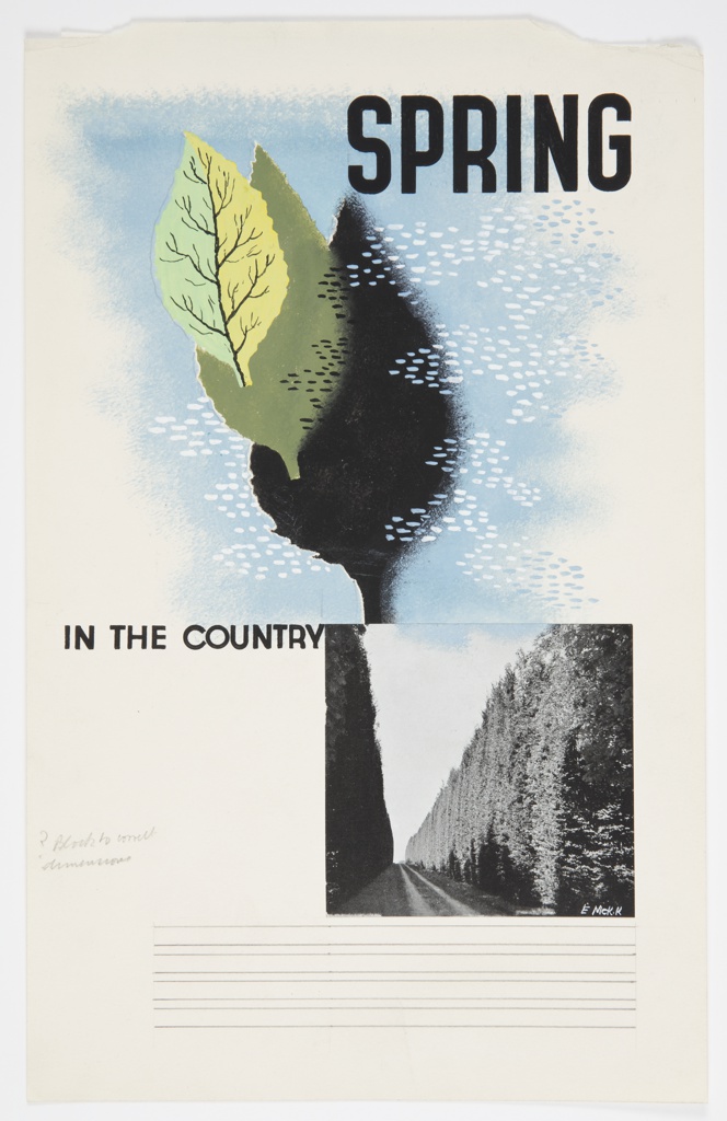 Drawing, Design for "Spring in the Country"; Designed by Edward McKnight Kauffer (American, active England, 1890–1954); Client: London Passenger Transport Board (England, GB, United Kingdom); England; brush and gouache, pen and black ink, photomontage, and graphite on heavy paper; 37.8 × 23.8 cm (14 7/8 × 9 3/8 in.) (irregular); Gift of Mrs. E. McKnight Kauffer; 1963-39-511