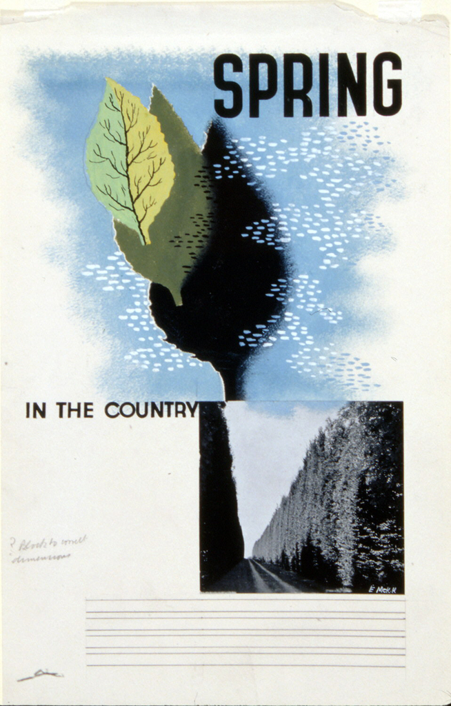 Drawing, Design for "Spring in the Country"; Designed by Edward McKnight Kauffer (American, active England, 1890–1954); Client: London Passenger Transport Board (England, GB, United Kingdom); England; brush and gouache, pen and black ink, photomontage, and graphite on heavy paper; 37.8 × 23.8 cm (14 7/8 × 9 3/8 in.) (irregular); Gift of Mrs. E. McKnight Kauffer; 1963-39-511