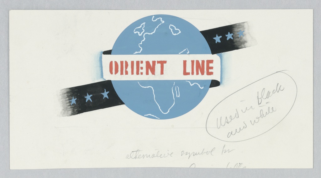 This is a Drawing. It was designed by Edward McKnight Kauffer and made for (as the client) Orient Line, Anderson, Green & Company Ltd.. It is dated July 20, 1934 and we acquired it in 1963. Its medium is graphite and blue, black, and red gouache on heavy paper. It is a part of the Drawings, Prints, and Graphic Design department.