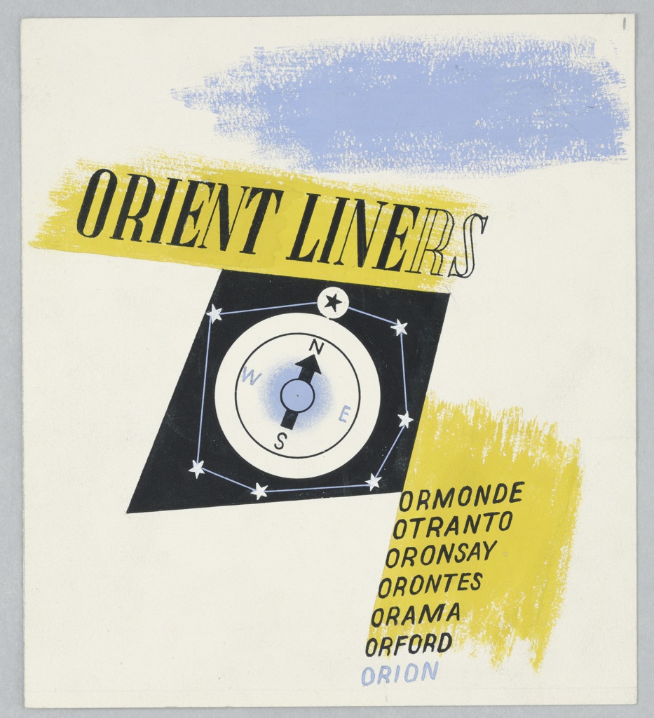 This is a Drawing. It was designed by Edward McKnight Kauffer and made for (as the client) Orient Line, Anderson, Green & Company Ltd.. It is dated ca. 1935 and we acquired it in 1963. Its medium is brush and blue, yellow, and black gouache on paper.. It is a part of the Drawings, Prints, and Graphic Design department.